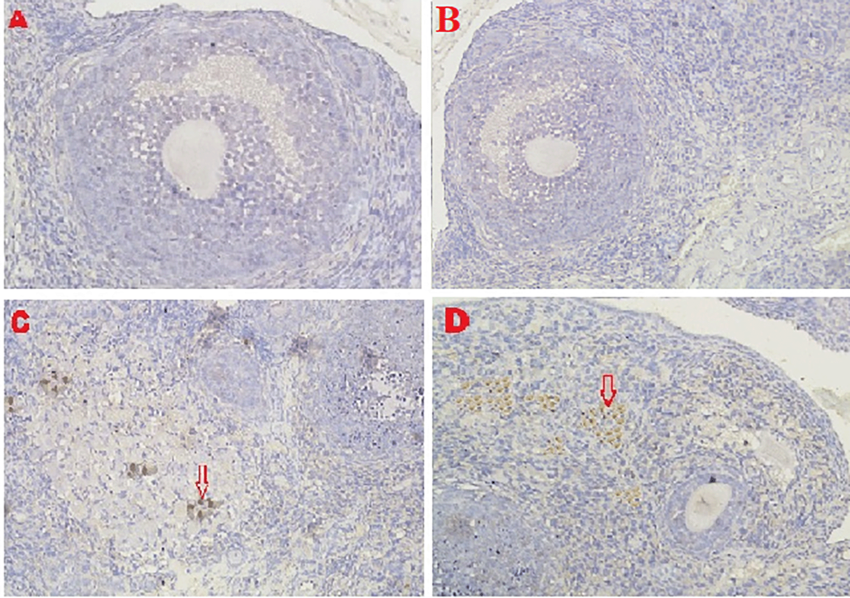The IHC score for caspase-3 expression in ovarian tissue from four treatments is shown in Figures 3, 6 and Table 2. As shown in Table 2, the average score of caspase-3 expression (brown) was 0.2a±0.42 for the positive (fertile) control group, 0.6a±0.52 for the T2 group, 4.8b±1.03 for the T1 group, and 7.3c±1.42 for the negative (infertile) control group.