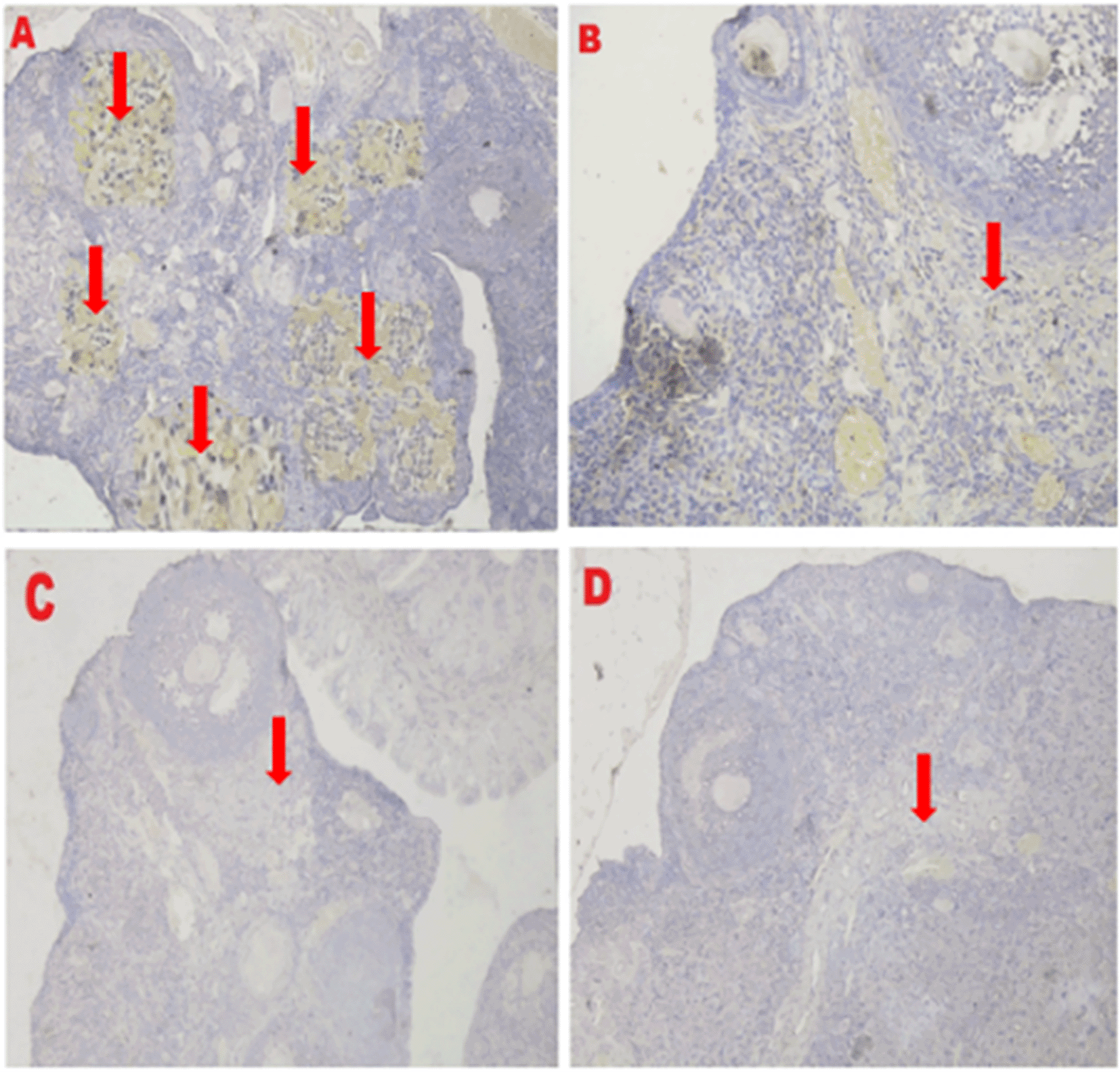 The IHC score of VEGF-1 expression in ovarian tissue from four treatments is shown in Figure 7 and Table 2. As shown in Table 2, the average score of VEGF-1 expression (brown) was 10.8c±1.55 for the positive (fertile) control group, 8.7b±0.48 for the T2 group, 0.4a±0.52 for the T1 group, and 0.2a±0.42 for the negative (infertile) control group.