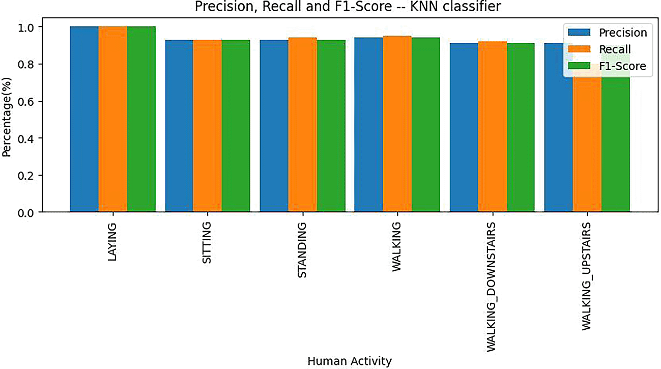 Precision, recall and F1 score values of the K-nearest neighbour classifier are depicted in the bar plot shown in Figure 11. From Figure 11, we can see that the activity Laying was predicted correctly without any incorrectly classified classes; hence, all metrics had a 100% score.