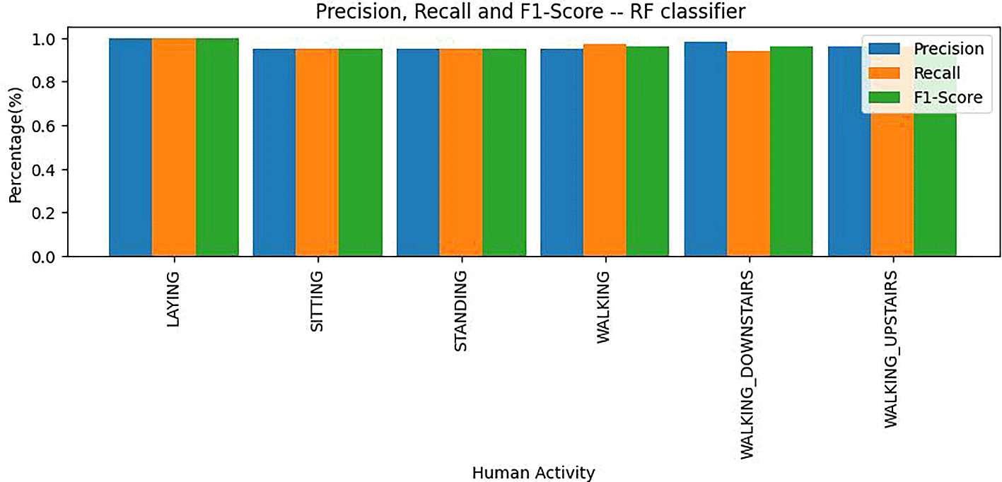 Precision, recall and F1 score values of random forest are depicted as a bar plot shown in Figure 13.From Figure 13 we can see that all instances having Laying as target were correctly predicted.