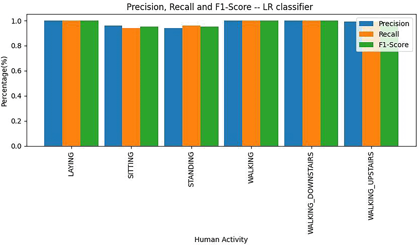 Precision, recall and F1 score values of logistic regression are depicted as a bar plot shown in Figure 15. From Figure 15, we can see that Laying, Walking, Walking_Downstairs instances were correctly classified.
