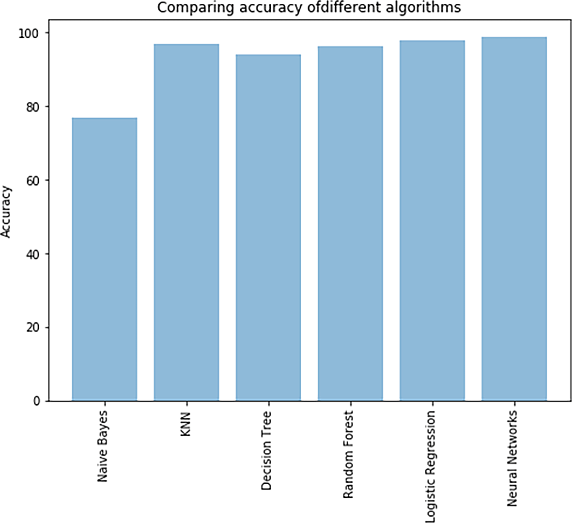 Comparison of different algorithms: Different algorithms used to train the model were considered as variable x and their corresponding accuracy as variable y. The bar graph drawn for these x and y variables is shown in Figure 17. The accuracy results are shown in Table 2. From Figure 17, when comparing all algorithms, neural network predicted the data with the highest accuracy, i.e.98.93%.