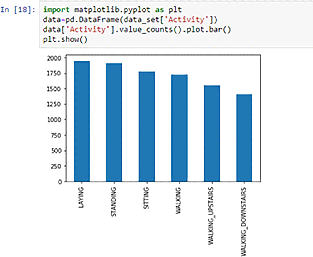A bar graph shows the comparison between different target classes. The bar graph showing how many persons had thesame classification is shownin Figure 4. The following observations were made from Figure 4: LAYING--1944, STANDING--1906, SITTING--1777, WALKING--1722, WALKING_UPSTAIRS--1544, WALKING_DOWNSTAIRS--1406.