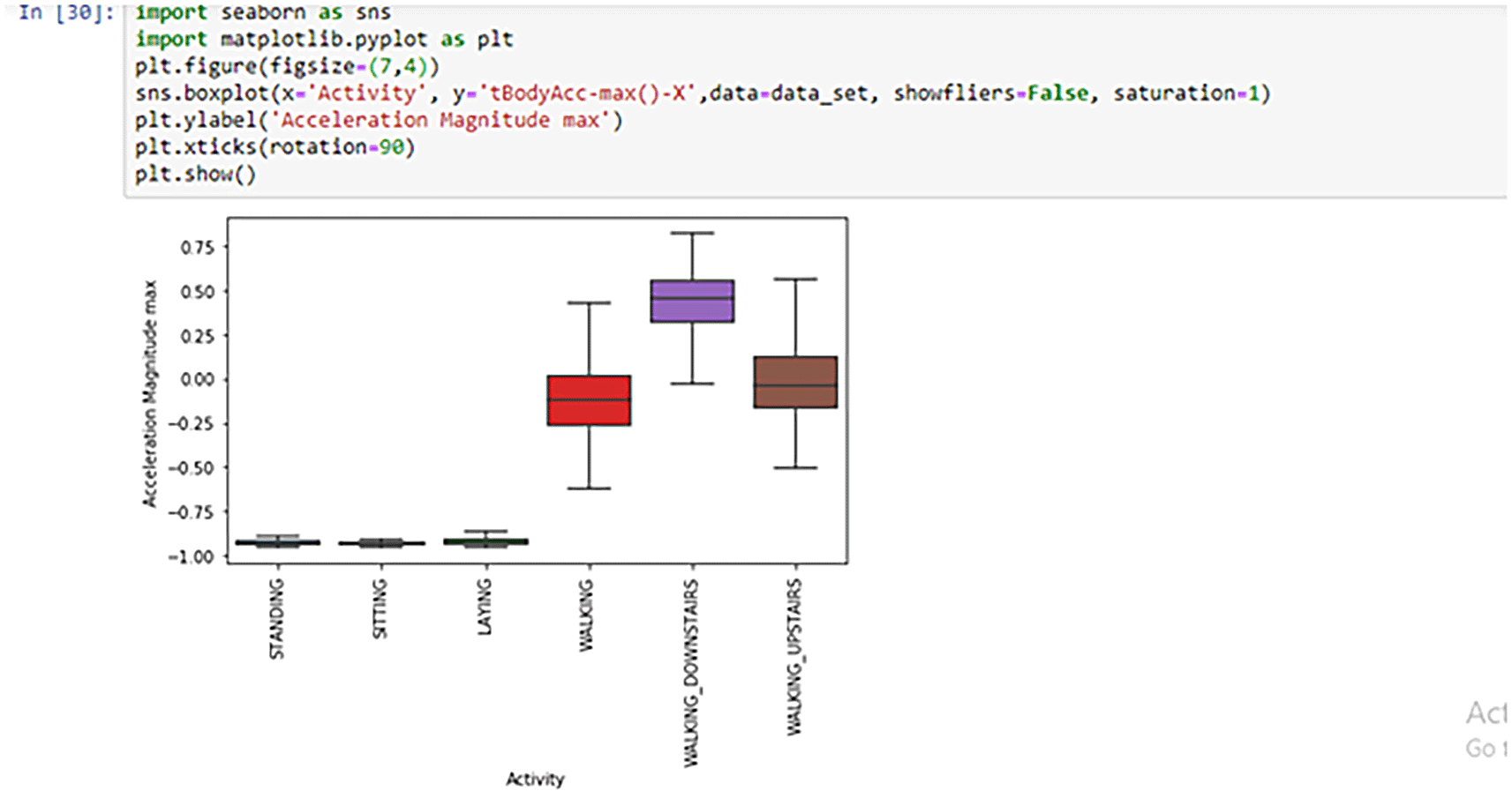 Box plot: Box plots show the distribution of data by using five measures, namely minimum, first quartile(Q1), median, third quartile(Q3), and maximum. The box plot is drawn for the target class ‘Activity’ and the feature ‘tBodyAcc-max()-X’ in Figure 5.