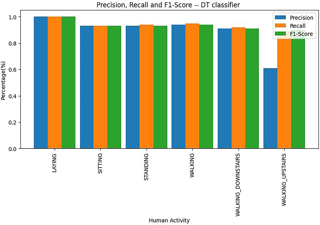 Precision, recall and F1 score values of decision tree classifier are depicted in the bar plot shown in Figure 9. From Figure 9 we can see that the class Laying was predicted correctly without any incorrectly classified classes.