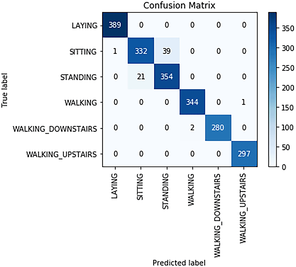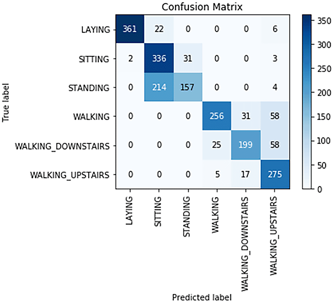 • Walking vs. Walking_Downstairs/Walking_Upstairs: Instances of “Walking” were sometimes misclassified as “Walking_Downstairs” or “Walking_Upstairs,” indicating difficulty in distinguishing between these activities. The model’s confusion could be attributed to the overlapping movement patterns and gradual transitions between walking on flat surfaces and walking with elevation changes.