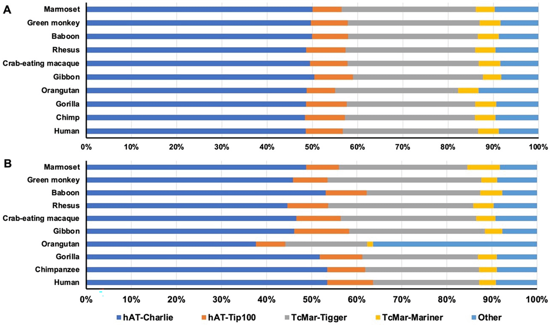 By composition in DNA transposon type, the majority of the da-DNAs belonged to the hAT and TcMar superfamilies with the hAT subfamilies (hAT-Charlie and hAT-Tip100) contributing to ~57% of da-DNAs and the hAT-Charlie subfamily alone contributing to ~50% of all da-DNAs in all genomes (Table S1, Figure 1A). The two TcMar families, TcMar-Tigger and TcMar-Mariner, contributed ~33% of da-DNAs, while the remaining families contributed to ~10% of da-DNAs. This composition pattern seems to be quite similar among all genomes, with the orangutan genome having a slightly lower portion from the hAT-Trip100 and TcMar-Tigger families but slightly more from the other families (Figure 1A, Table S1).