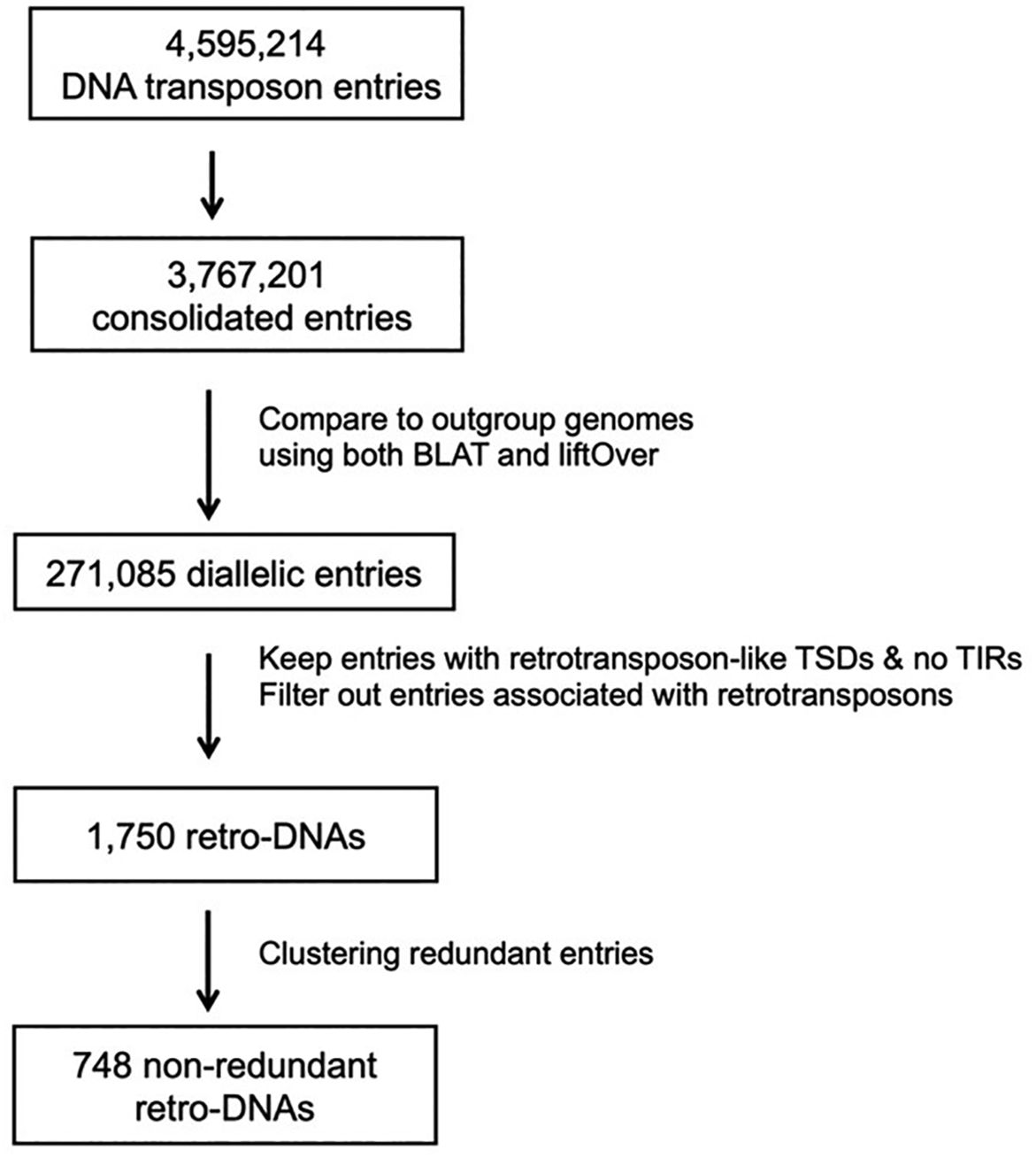 Filtering against retrotransposon transductions: To ensure the presence of a DNA transposon was a result of active transposition, rather than a passive result of other processes, e.g., retrotransposition-mediated transductions, we mapped the candidate entries against the known retrotransposons in the ten primate genomes based on their genomic positions. Specifically, the sequences of candidates from the previous step were mapped back onto the host genome using BLAT, followed by removing all entries located within 50 bps to a retrotransposon (excluding entries inserted into a retrotransposon), because such entries could be a result of retrotransposition-mediated transduction. All entries left at this point were considered candidates of “retro-DNAs” for being retrotransposons derived from DNA transposon sequences but lacking TIRs and having TSD at 8 bp or longer.