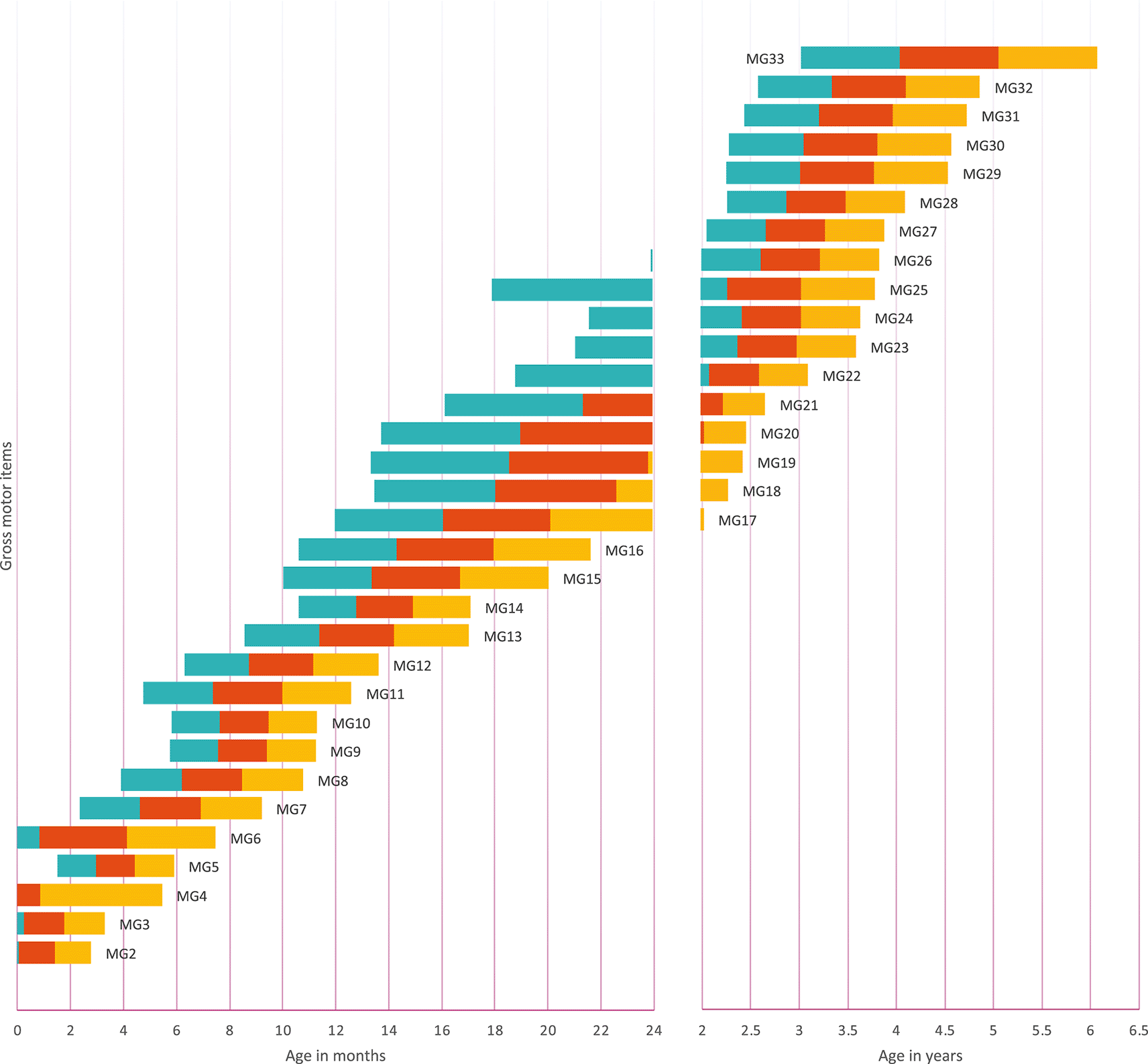 Notes: MG1 Hold their head when carried; MG2 Lift their chin off the floor; MG3 From the prone position, they can lift their head to 90 degrees; MG4 Support head when lifted by hands; MG5 Flip over; MG6 Raise head, shoulders, and chest from a prone position; MG7 Start creeping; MG8 Start crawling position; MG9 Stand up with support; MG10 Sits up unassisted; MG11 Crawl with displacement alternating knees and hands; MG12 Take steps with help; MG13 Stand up unassisted; MG14 Walk without help; MG15 They crouch and stand up; MG16 Walk well with cross-scroll; MG17 Run, they may fall; MG18 Throw ball; MG19 Kick the ball; MG20 Run showing coordination in their movements; MG21 Run well, stops and start again without falling; MG22 Jump with feet together; MG23 Jump moving with both feet; MG24 Stand on one foot for 3 seconds; MG25 Stand on tiptoe with both feet; MG26 Walk on tiptoe; MG27 Walk in a straight line keeping balance; MG28 Jump on one foot without support; MG29 Can catch a ball with both hands; MG30 Bounce and catch the ball; MG31 Stand on one foot for 5 seconds; MG32 Jump moving with one foot; MG33 Jump alternating feet.