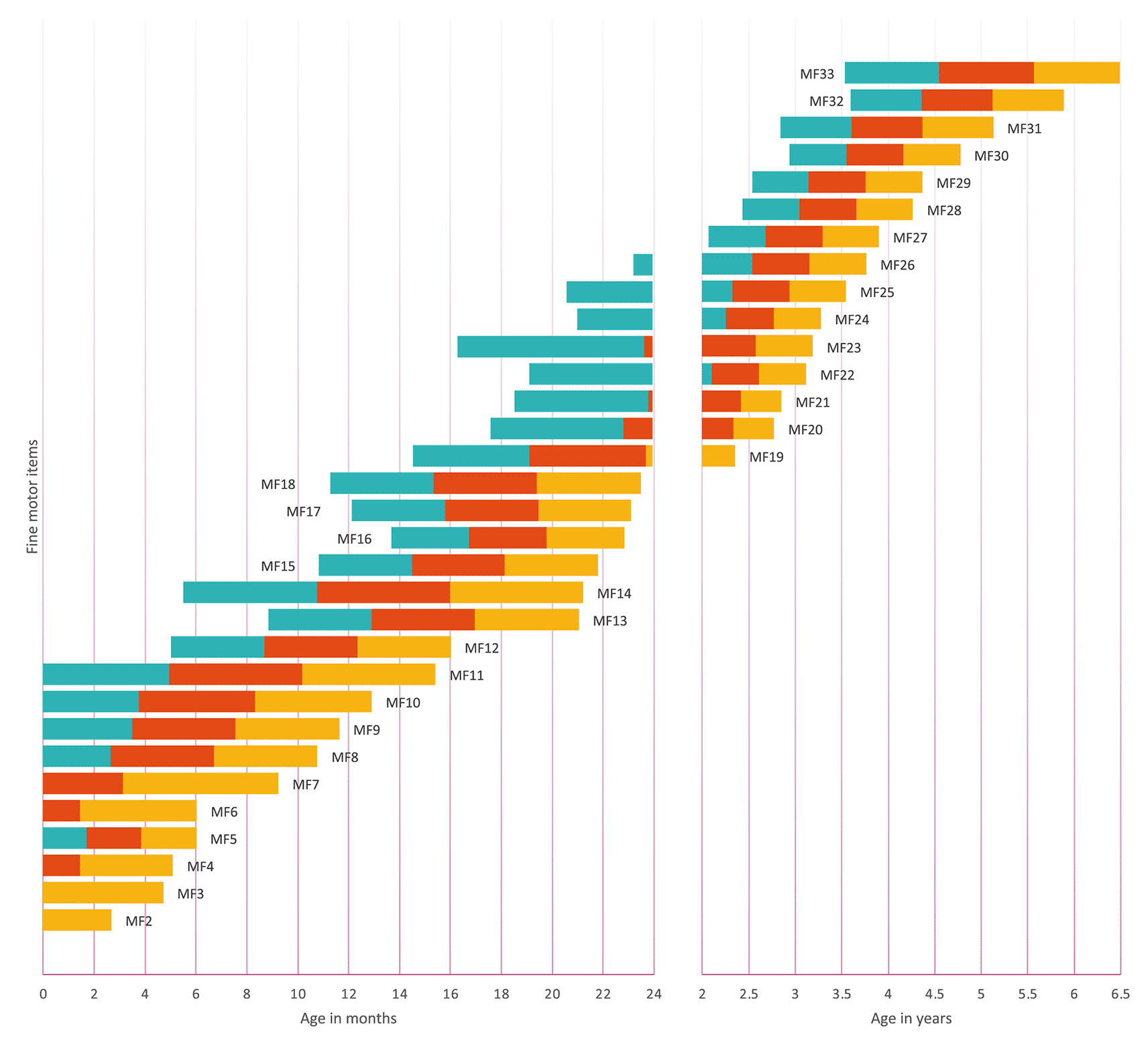 Notes: MF1 Palmar grasp reflex; MF2 Stare the midline; MF3 Visually focuses on an object and tracks it horizontally; MF4 Keep hands open when awake; MF5 Hold an object in hand; MF6 Show interest in putting an object in their mouth; MF7 Visually focus on an object and follow it from top to bottom; MF8 Grasp large objects voluntarily; MF9 Hold an object in each hand; MF10 Pass an object from one hand to another; MF11 Pick up small objects as if their fingers were a rake; MF12 Find the object under a blanket; MF13 Put and take out objects from the container; MF14 Grasp with thumb and forefinger (tweezers); MF15 Pick up a spoon and brings it to their mouth; MF16 Scribble; MF17 Push a car; MF18 Turn pages of a book; MF19 Make a tower of two cubes; MF20 Put nails on a board; MF21 Make a tower of six cubes; MF22 Make a ball of paper; MF23 Tear paper with both hands; MF24 Make shapes with putty; MF25 Rotate hand to unscrew; MF26 String; MF27 Copy a horizontal and vertical line; MF28 Copy a circle; MF29 Copy a cross; MF30 Know how to button and unbutton; MF31 Color without leaving the outline of the drawing; MF32 Draw a human figure; MF33 Cut paper with scissors.