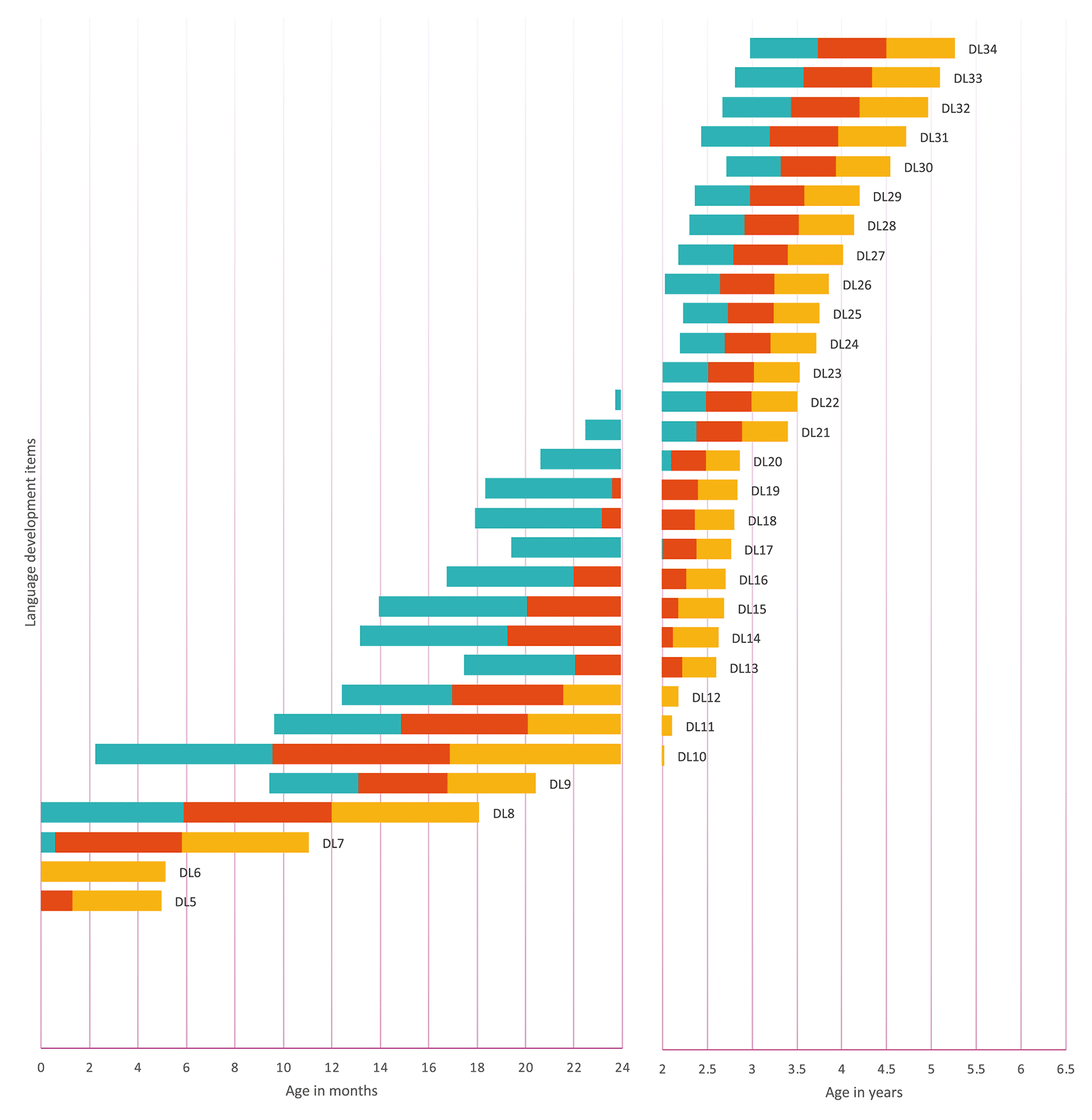 Notes: DL1 Calm down when speaking to them; DL2 Startle or jump in response to sounds; DL3 Cry to express needs; DL4 They laugh; DL5 Make sounds with the throat; DL6 Turn their head when they search for a sound; DL7 React when called by their name; DL8 Pronounce syllables like Ma, Pa, Ba, Ta; DL9 Point with their finger when they want something; DL10 Repeat the same syllable twice “Dada, Mama, Mimi, Tata, Papa, Yaya, Baba”; DL11 Understand the meaning of the word no; DL12 Follow one-step commands; DL13 Follow two-step instructions; DL14 Answer with yes or no; DL15 Pronounce their first words with communicative intention; DL16 Recognize at least 6 objects; DL17 Point to 5 parts of their body; DL18 Use a two-word phrase; DL19 Say 6 words; DL20 Say their name; DL21 Know the use of three or more objects; DL22 Can identify 10 objects by name; DL23 Pronounce sentences of three words; DL24 Use more than 15 words; DL25 Use long sentences; DL26 Know the qualities or characteristics of an object; DL27 Pronounce the sounds of words correctly; DL28 Describe the drawing; DL29 Name at least three things in a category; DL30 Recognize opposites; DL31 Can count up to 5 or more objects; DL32 Answer two comprehension questions; DL33 Compare objects; DL34 Tell a story from a sequence of images.