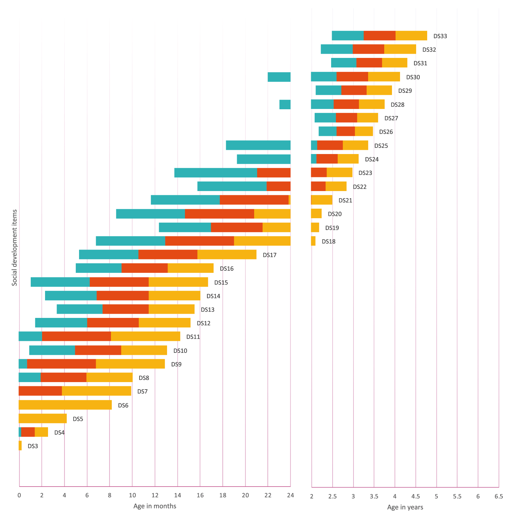Notes: DS1 Calm down with family members or caregivers; DS2 Smile spontaneously; DS3 Smile in response to a person; DS4 Recognize the voice of the main caregiver; DS5 Make eye contact; DS6 Touch the examiner's hands; DS7 They are aware of their hands (body); DS8 Try to hold a cup when being fed; DS9 Respond to a conversation; DS10 Raise their arms or indicate that they want to be carried; DS11 Laugh out loud; DS12 Explore their face when they are in front of the mirror; DS13 Show interest or intention to feed themselves; DS14 Look for continuing the game; DS15 Explore the environment; DS16 Participate in games; DS17 Wave or verbally greet; DS18 Express their satisfaction when they achieve something; DS19 Take a glass without spilling; DS20 Imitate adult actions; DS21 Recognize their belongings; DS22 Express interest in playing with other children; DS23 Symbolic game; DS24 Refer to themselves as “I”; DS25 Say the names of the people with whom they live; DS26 They urinate or defecate independently without dirtying their clothes; DS27 Indicate in some way that they need to urinate or defecate; DS28 Identify basic emotions in images; DS29 Come up with games; DS30 Share their belongings; DS31 Recognize basic emotions in themselves and express them verbally; DS32 Recognize and express basic emotions in others; DS33 Participate in games respecting rules and turns.