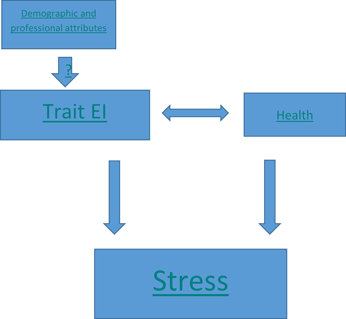 The proposed work can be summarized with a diagrammatic model depicting the relationship between the parameters (Figure 1). The effect of demographic and professional attributes on trait EI is questionable and our hypothesis suggests they don’t impact trait EI. Further, trait EI and health behavior are two independent variables, which positively impact each other and have a negative correlation with stress.