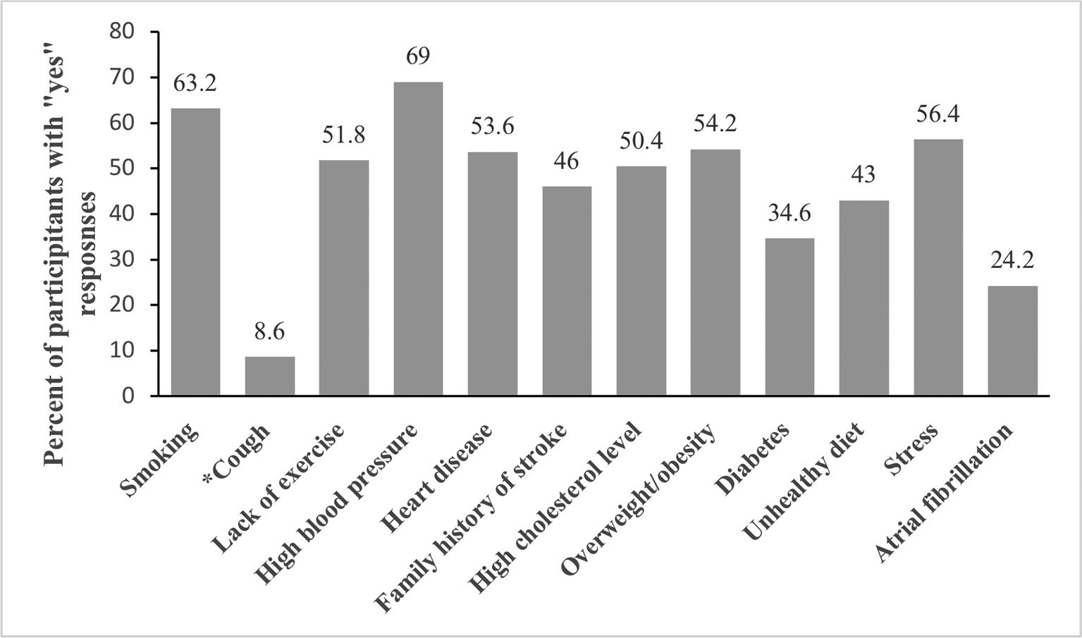 Figure 2 presents positive (yes) responses to questions on stroke risk factors. More than half of the participants correctly identified smoking (63.2%), lack of exercise (51.8%), high blood pressure (69%), heart disease (53.6%), high cholesterol (50.4%), being overweight/obese (54.2%), and stress (56.4%). Fewer than half knew about a family history of stroke (46%), diabetes (34.6%), an unhealthy diet (43 %), atrial fibrillation (24.2%), and 8% incorrectly identified cough as a risk factor for stroke.