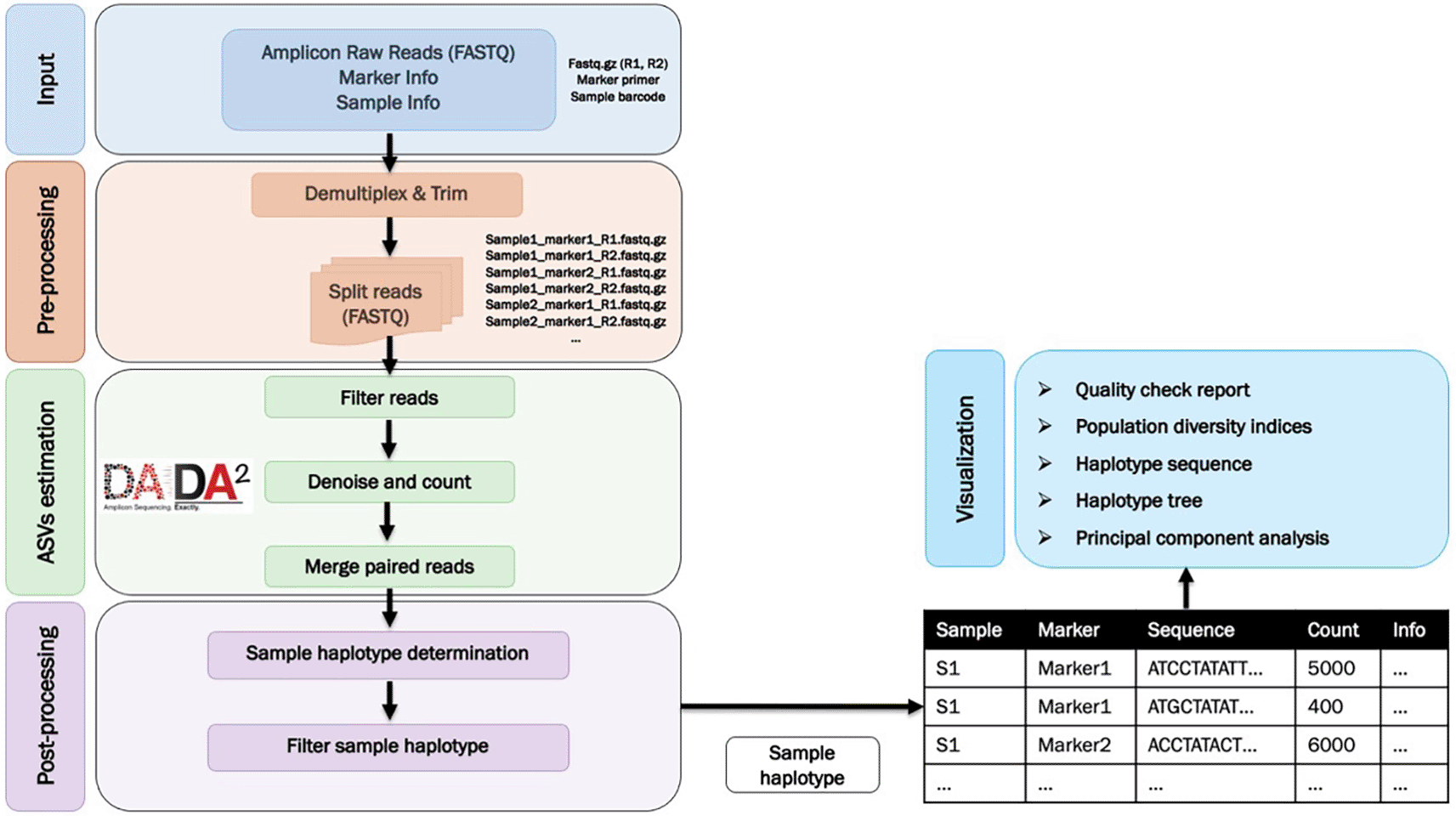 The data pre-processing step demultiplexes the raw paired-end FASTQ reads and trims the sample barcodes and target amplicon primer sequences as well as assigns the sequence to each sample and marker (amplicon target) combination. As each individual has a unique oligonucleotide barcode and each marker has a unique primer sequence distinguishing it from other markers, sequence reads can be de-multiplexed to separate individual samples and different markers, followed by trimming the primer sequence. The data pre-processing is handled using the Biostrings, ShortRead, rlang, magrittr, future, and tidyverse R packages.