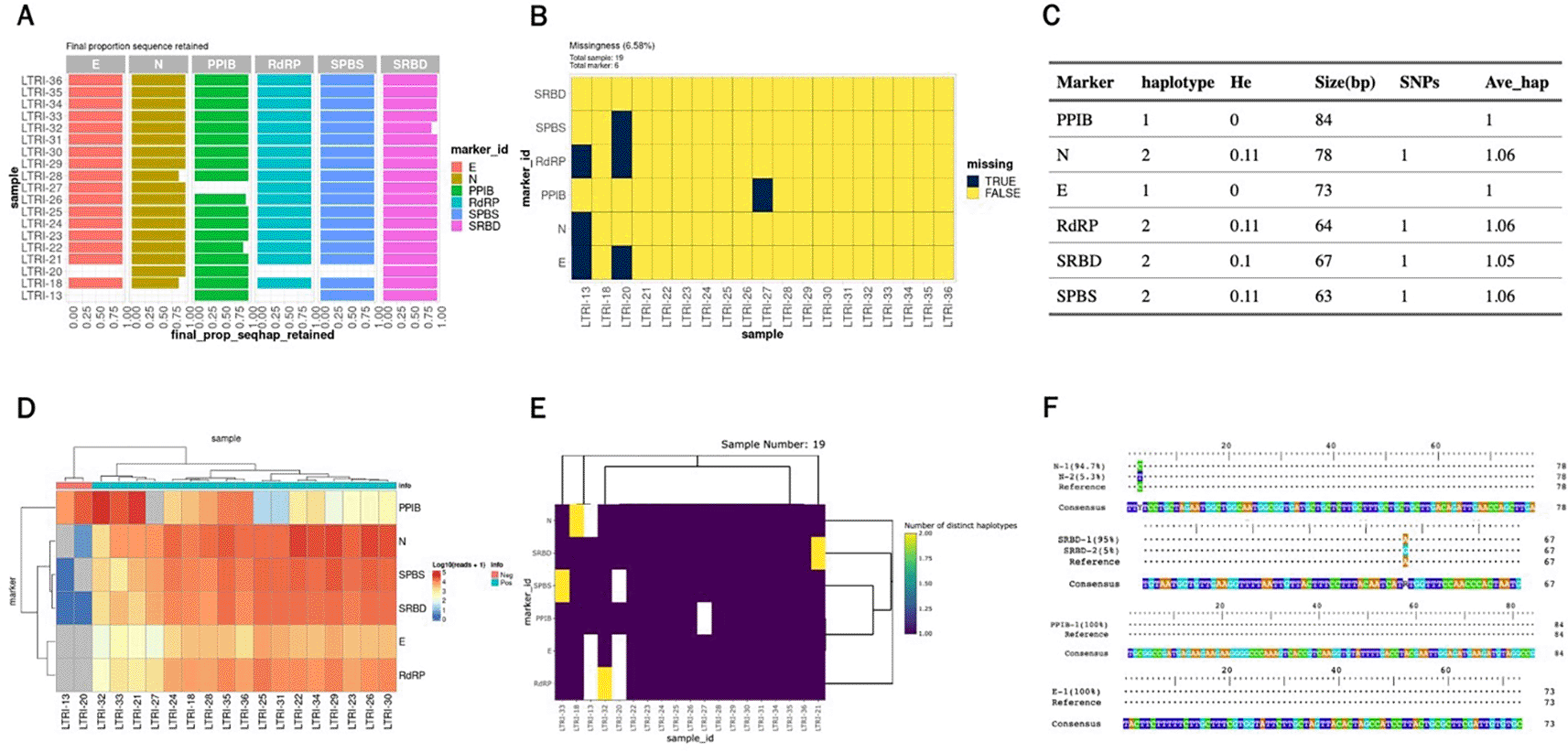 A. The proportion of sequences that are finally retained. B. Missing values in the dataset. C. Haplotype diversity metrics for amplicon markers in the dataset. D. Read counts for amplicon markers and all samples in the dataset. E. Number of unique haplotypes detected per amplicon per sample. F. Visualisation of haplotype and reference sequences.