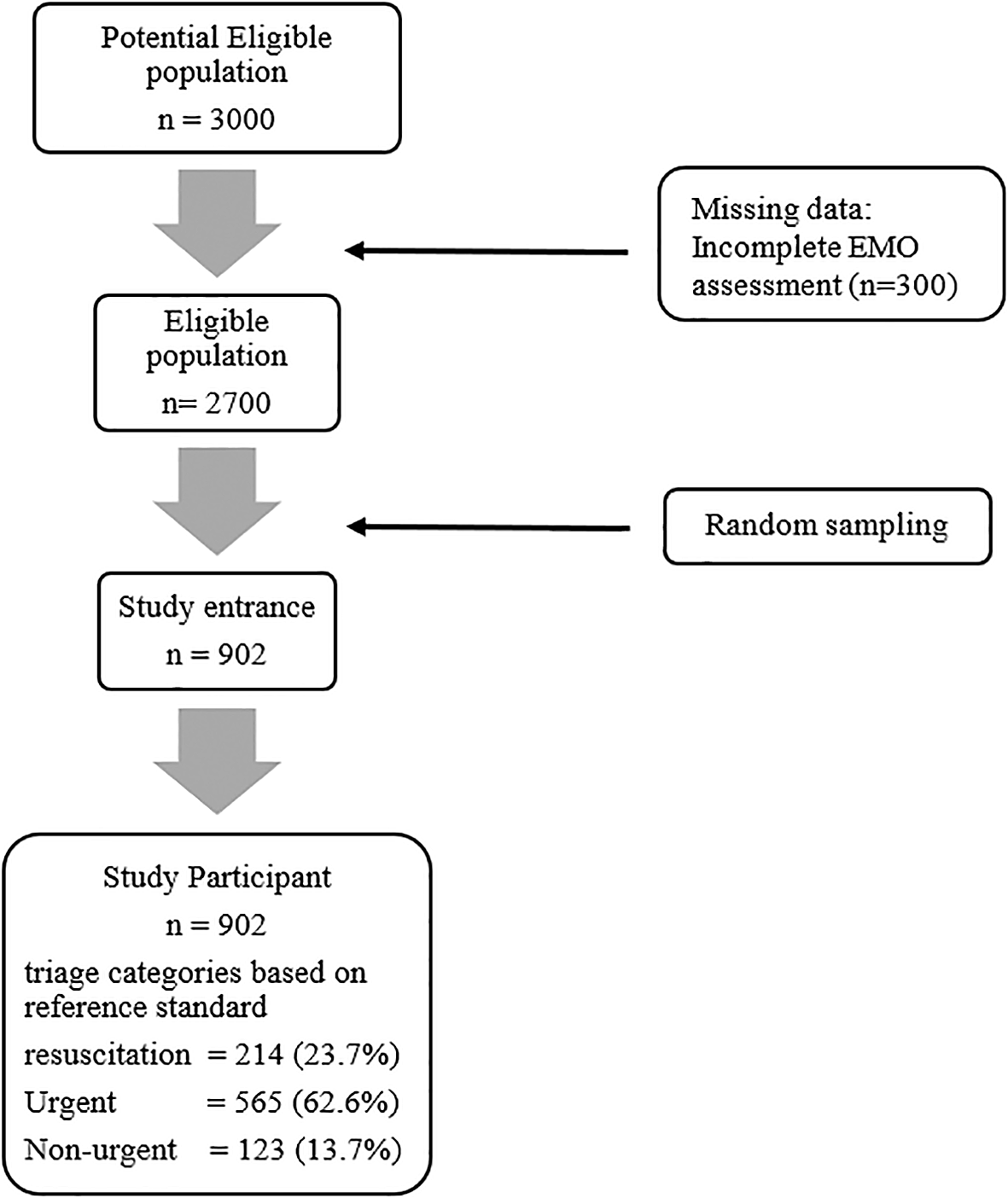 Triage nurses and EMOs performed triage assessment for all eligible ED patients during the study period. Simple random sampling will then be performed by the researchers using random generator in Stata ver. 17.0 to obtain participants from all eligible ED patients based on sample size measurement (Figure 1).