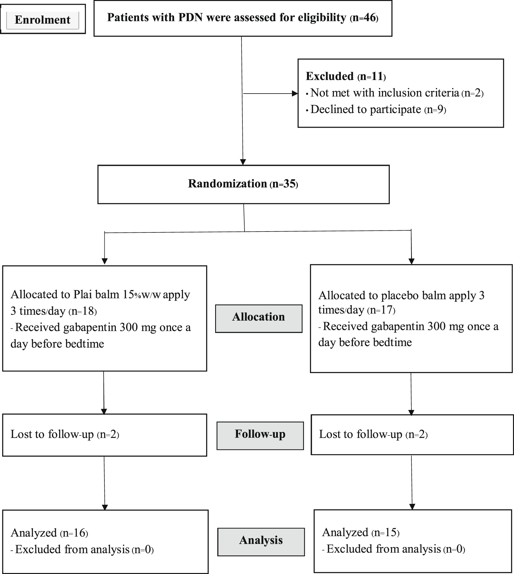 Block-of-four randomization was applied to this study, concealment was done by telephone calls to research assistants. Participants were divided into two groups. All participants received oral gabapentin of 300 mg, one tablet a day before bedtime as a standard regimen. The intervention group (n=16) received Plai balm 15% w/w 0.5 gram to apply on their feet three times a day and the control group (n=15) received the placebo balm to apply similarly.
