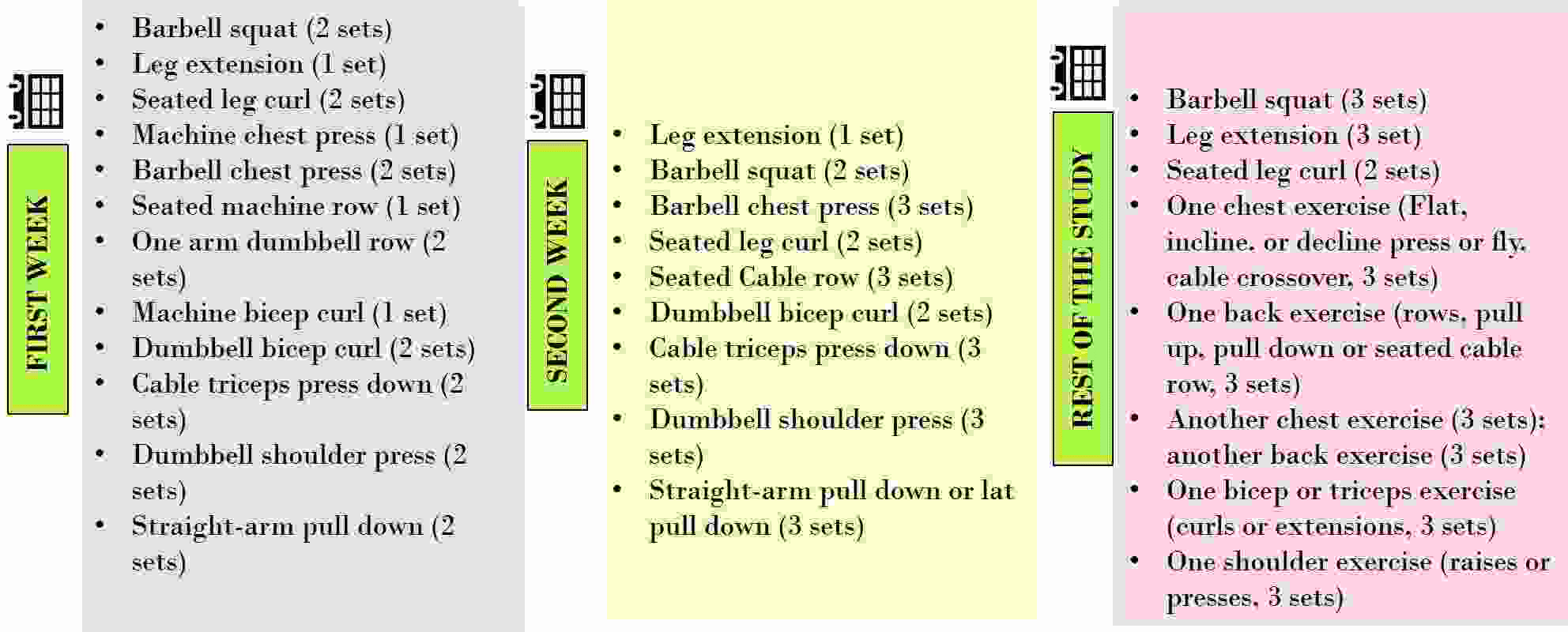 The resistance training regimen used in this study was focused on improving muscle strength, increasing muscle mass and enhancing cardiorespiratory endurance. Various resistance exercises were chosen with the objective of training targeted muscle groups. Such training programs target the upper and lower body and consist of a series of exercises with suitable resistance, grouped into multiple sets and repetitions as per the National Strength and Conditioning Association’s (NSCA) regulations and guidelines.20 Each participant was required to complete the training session every alternate day with a one-day complete rest per week. Therefore, participants were training three days per week. Each training session started with a warm-up of low intensity aerobic exercise. Participants were instructed to perform the maximum repetitions possible for each set until exhaustion. The exercise program is detailed in Figure 1, comprising exercises for week 1, week 2 and remainder of the study (weeks 3 to 8).
