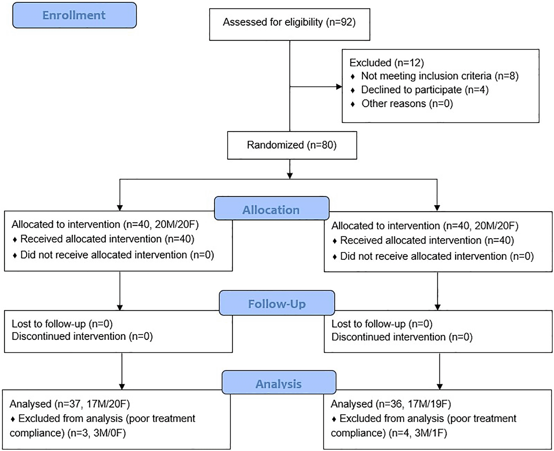 A total of 92 people were screened for participation in the study, of which 80 met the inclusion criteria and were enrolled in the study (Figure 2). All enrolled participants completed the eight-week follow-up. However, four subjects (3 males and 1 female) in the PB and three subjects (3 males) in the AG group did not consume supplementation after their second visit. These participants were documented as having poor compliance to treatment and were excluded from the efficacy analysis. Reasons for premature medication discontinuation were reported as unintentional forgetfulness due to travel and other personal issues by these seven subjects. Baseline demographic characteristics and vital signs are detailed in Table 1 and indicate that the study population was homogenous with no significant differences between the treatment and control groups. Baseline parameters across both the groups are displayed in Table 2.