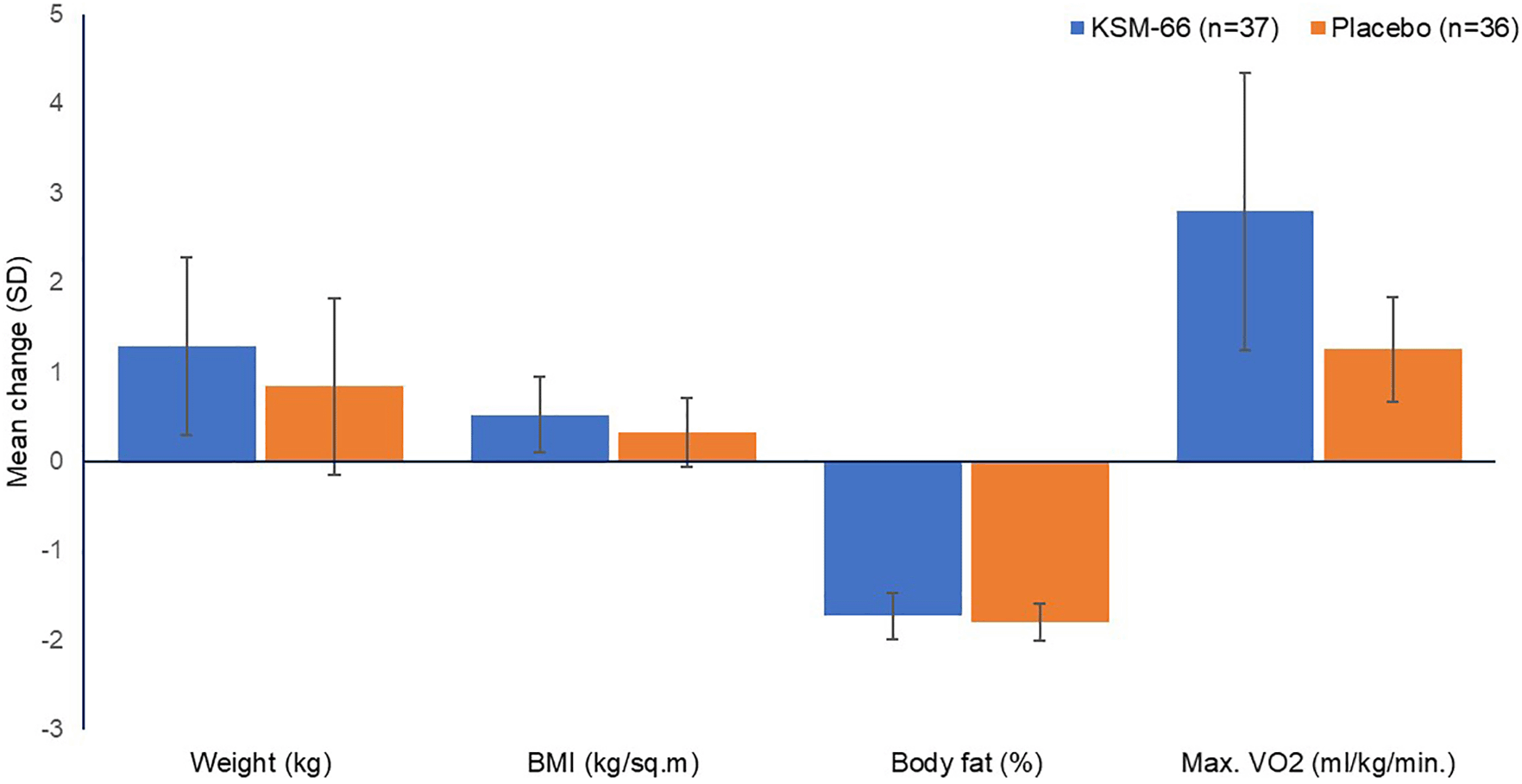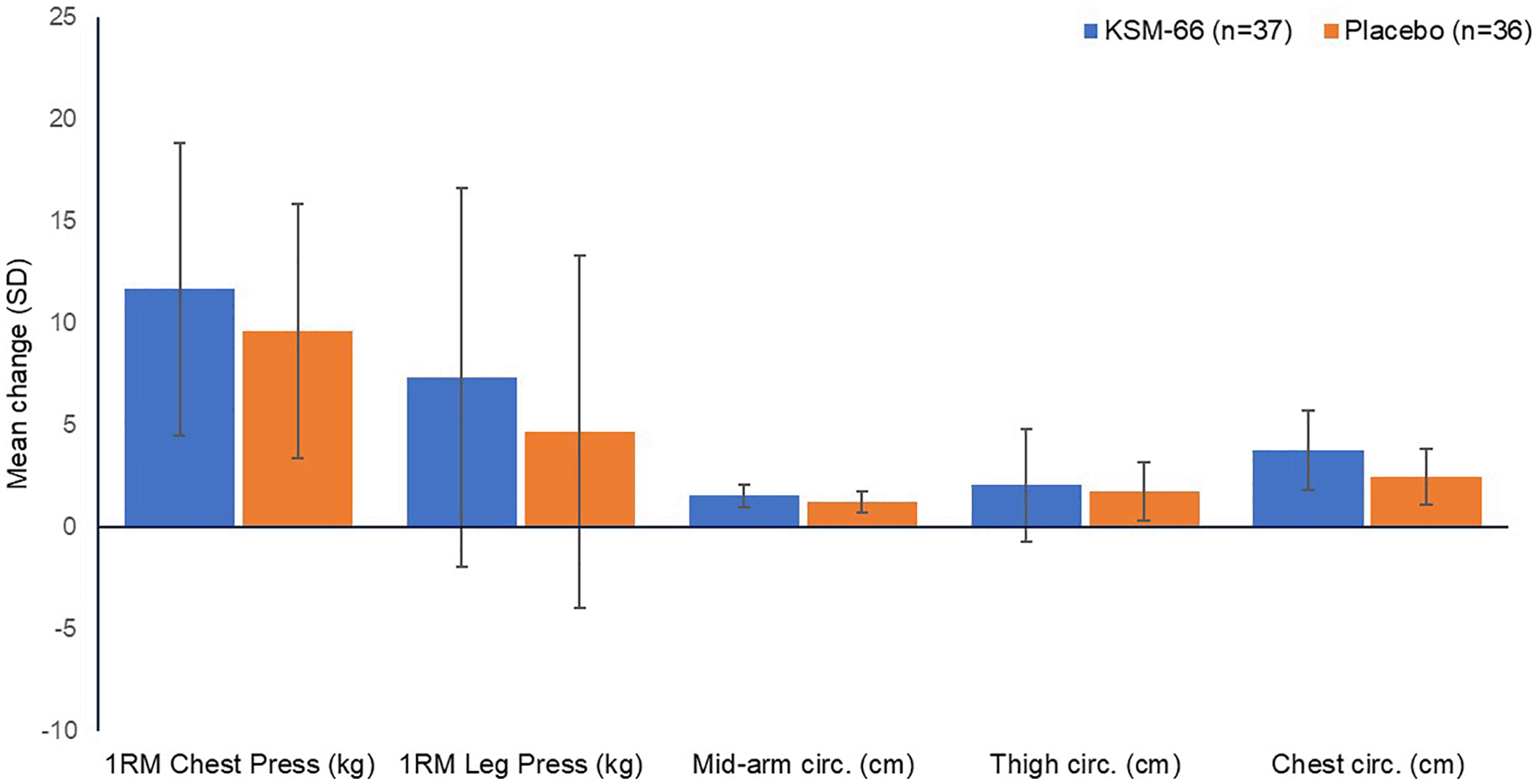 The present study assessed the impact of AG root extract supplementation on resistance training adaptations such as muscle strength and endurance in healthy and active adults. The primary findings of the study are that significantly greater improvements in muscle strength for both lower body (1 RM Leg press) and upper body (1 RM Chest press) occurred in participants consuming AG as compared to PB. In addition, AG supplementation significantly increased muscle size and endurance. However, there were no differences in thigh muscle size (male) and body composition (body fat) between the two groups.