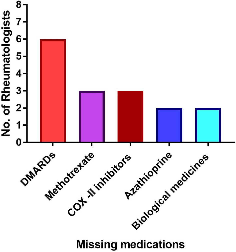 The majority of hospitals (six out of eight rheumatologists) lacked disease-modifying antirheumatic medicines (DMARDs). Several rheumatologists also said that methotrexate, azathioprine, COX-II selective NSAIDs, and biological medications were not available (Figure 1).
