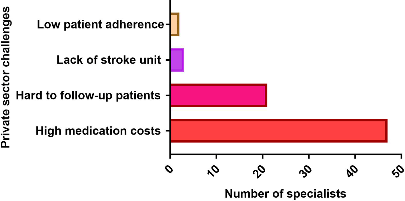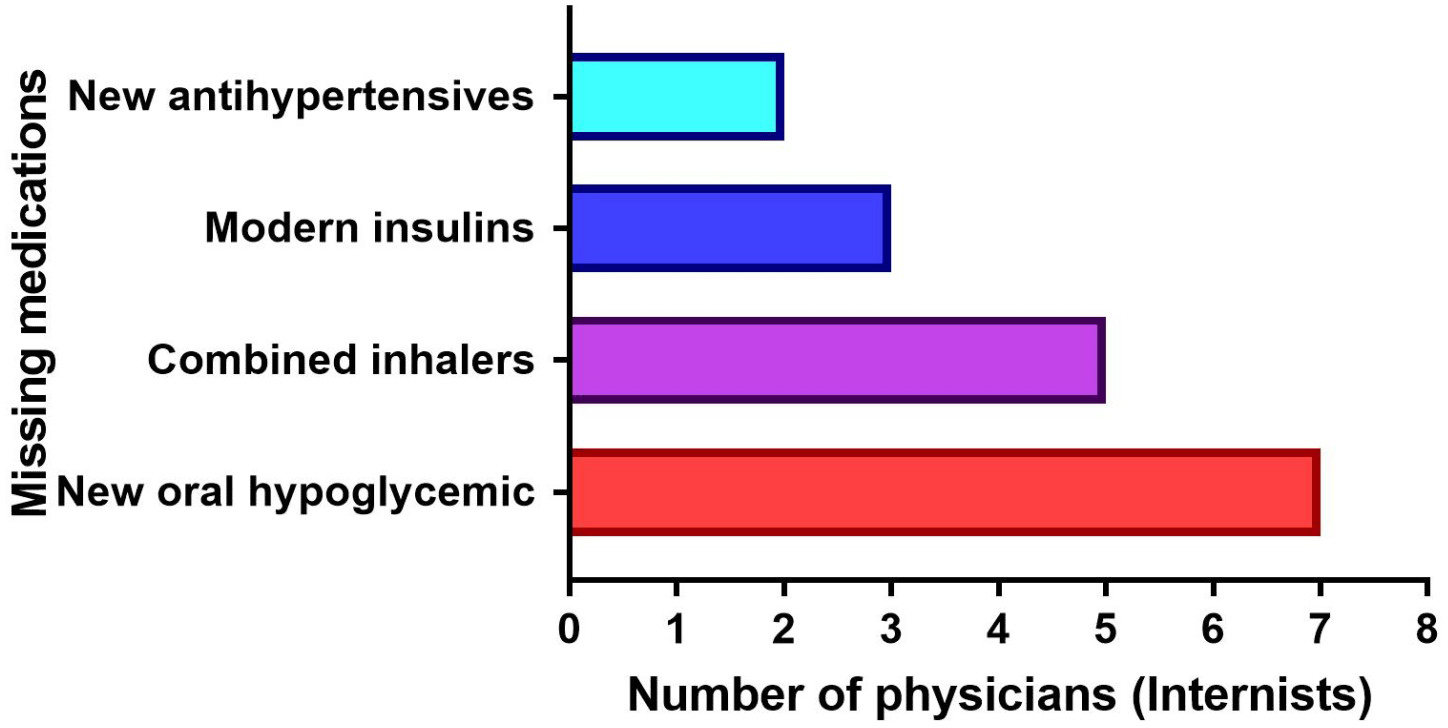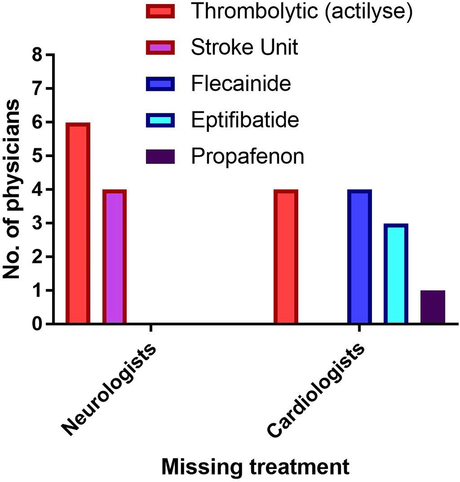 Six neurologists and four out of five cardiologists concurred that anti-thrombolytic medications are in short supply (e.g., actilyse). In addition, the majority of neurologists (four out of six) recognized that their facilities lacked a specialized stroke unit for treating patients with cerebrovascular accidents (CVA) (Figure 2). Flecainide (antiarrhythmic) and Platelet Glycoprotein IIb/III inhibitor (Eptifibatide) were the most frequently missed cardiovascular medications in hospitals (Figure 2).