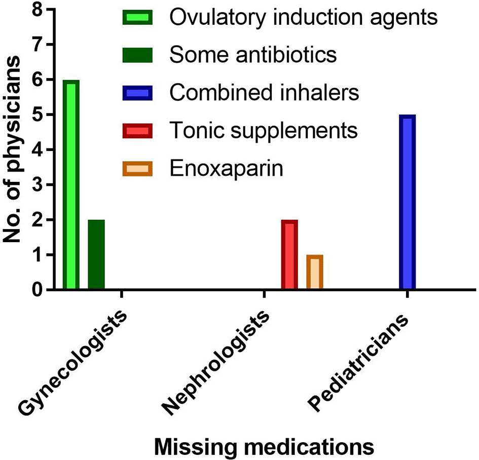 All gynecologists encountered a shortage of ovulation-inducing medications (such as clomiphene and letrozole) (Figure 3). The majority of pediatricians and internists reported a shortage of cortisone-plus-short-acting beta2-agonist (SABA)-containing combination asthma inhalers (Figures 3 and 4). In addition, seven out of ten internal medicine doctors reported a shortage of innovative oral hypoglycemic medicines (Figure 4).