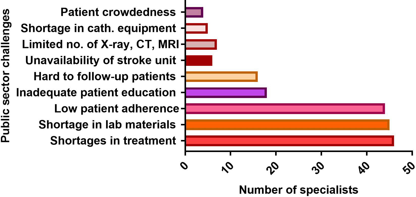 The majority of medications and investigational tools that aid physicians in disease diagnosis were scarce or unavailable in Iraqi public health care settings. The shortage of life-saving treatments and the absence of important centers such as the stroke unit in all hospitals in the province make it difficult for specialists to diagnose and treat such cases, forcing them to refer patients to the private sector or recommend medication and lab tests from outside (private settings).