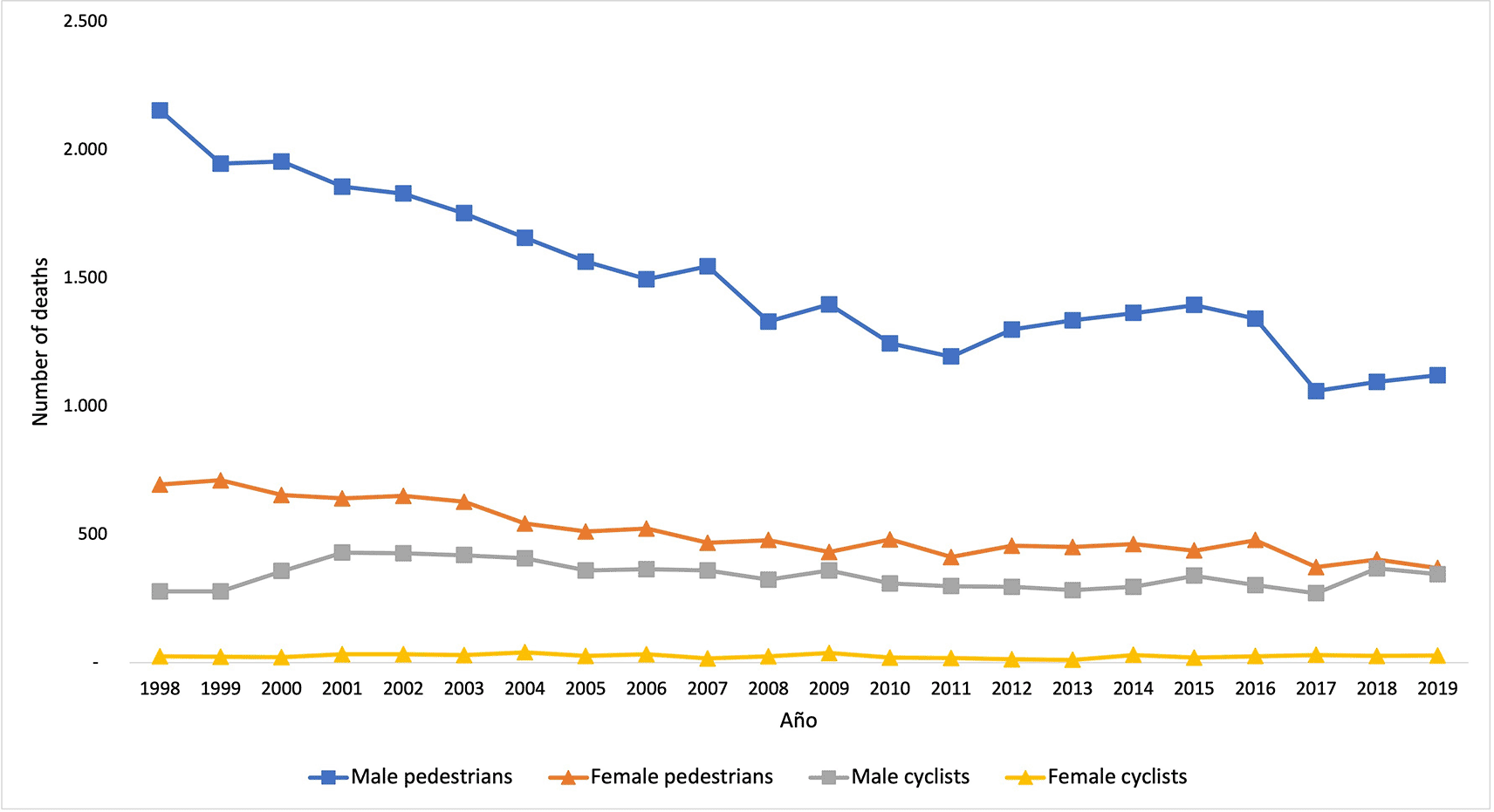 In the period from 1998 to 2019, there were 52,226 deaths due to traffic accidents in Colombia: 44,203 pedestrians and 8,023 cyclists. A 48% reduction in the number of deaths among pedestrians was observed in the period analyzed; the year with the highest number of deaths was 1998 (2,854) the one with the fewest was 2017 (1,431). The behavior was different for the deaths among cyclists, showing variations over time and noticing that the highest number of deaths was in 2001 (462) and the lowest in 2013 (294); in general, the increase was 24% when comparing the number of deaths between 1998 to 2019.