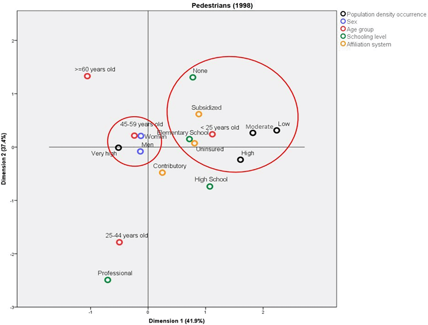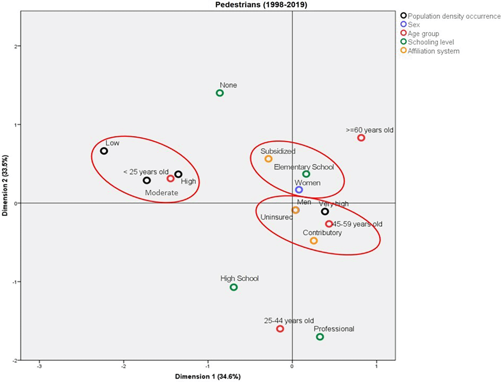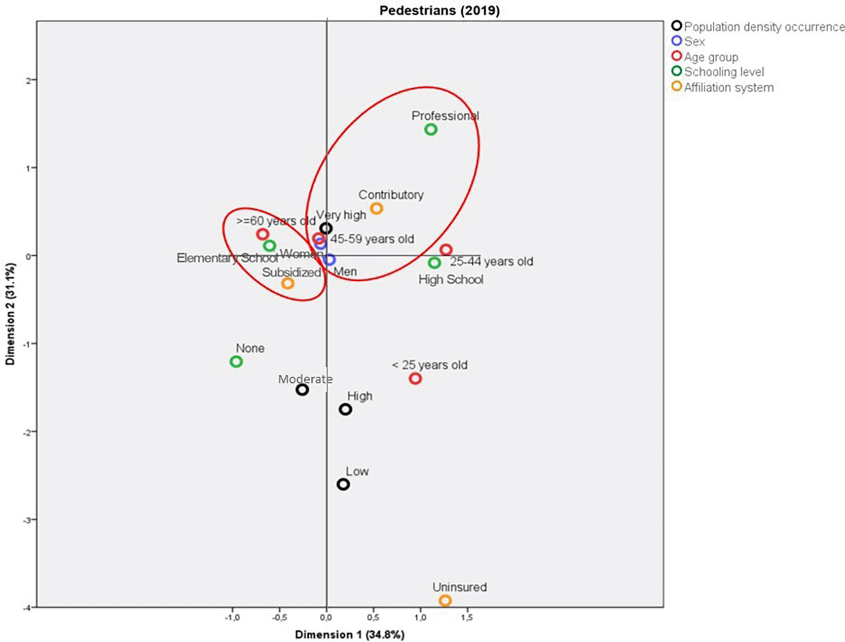 Three important profiles that represent the main characteristics of the pedestrians who died due to traffic accidents were observed. A profile represented by the deaths in municipalities with low, moderate, and high population density, these cases corresponded mainly to people under 25 years of age. The deaths in municipalities with very high population density were mainly among individuals aged between 45 and 49 years old and were enrolled in the contributory health regime. On the other hand, the deaths among female pedestrians showed the affiliation to the subsidized health regime and Elementary School education as common elements. For males, it was not possible to establish a profile.