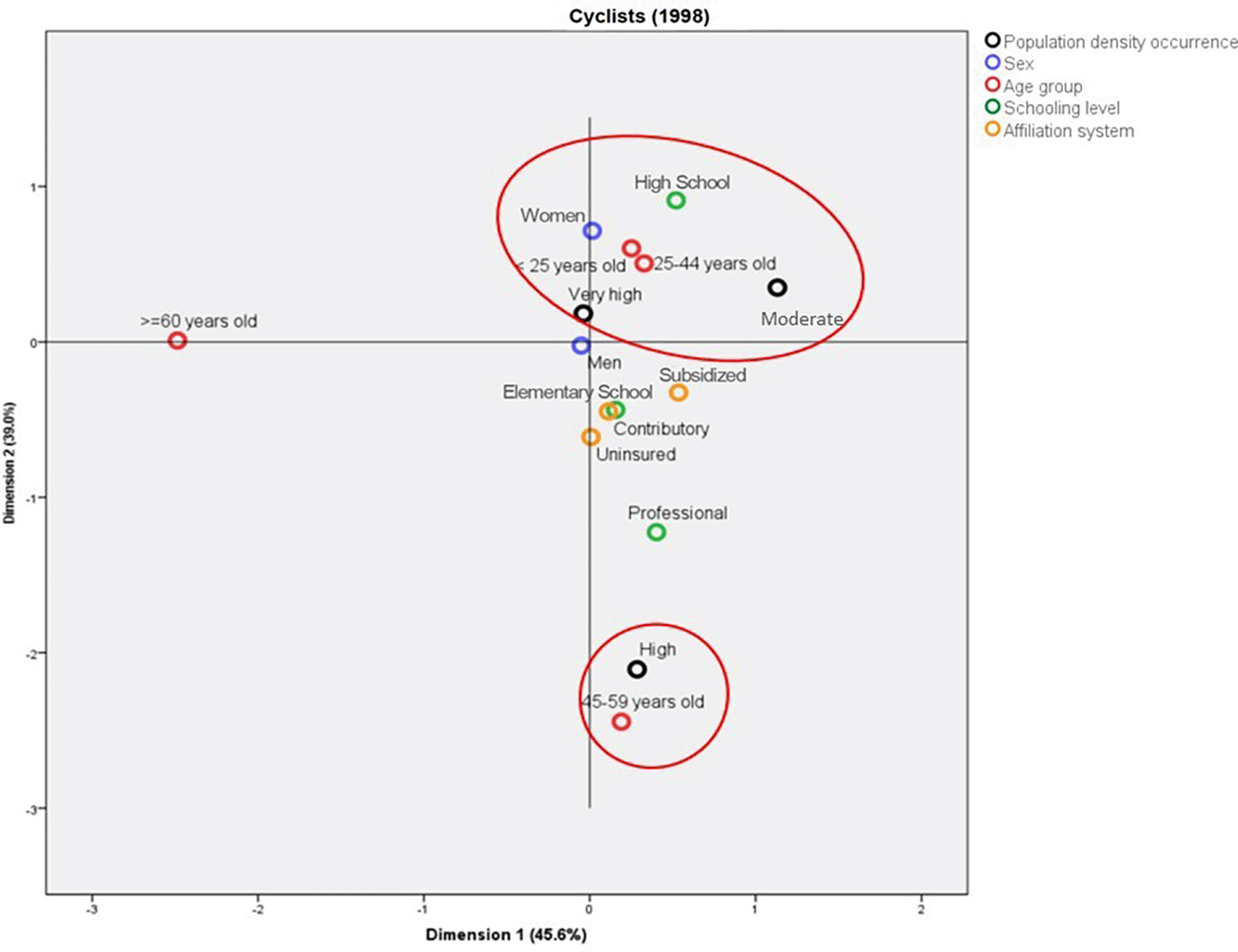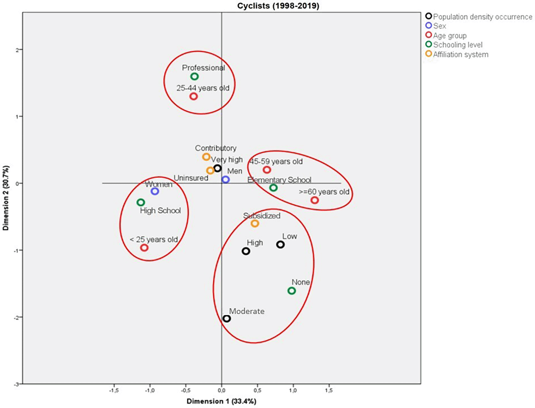 Among the cyclists, the deaths due to traffic accidents differed mainly by age group. It is noticed that the deaths among cyclists aged less than 25 years old were characterized as females, with Elementary School as the highest schooling level. On the other hand, the cyclists aged between 25 and 44 years old had attained professional schooling levels, whereas the victims over 45 years old had Elementary School as their highest educational level. In contrast, the deaths in municipalities with low, moderate, and high population density corresponded to individuals that were illiterate and belonged to the subsidized affiliation regime.