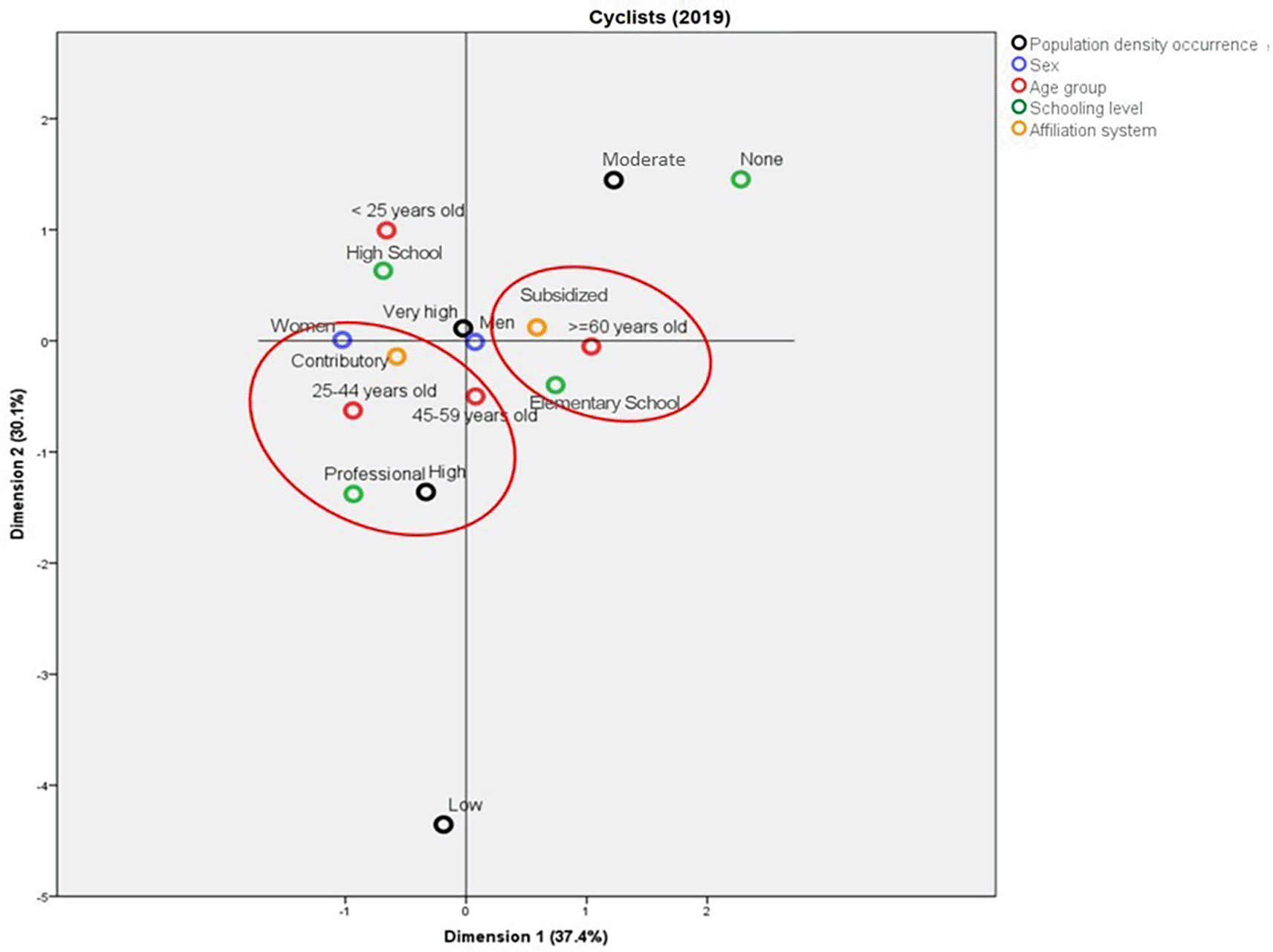 The model obtained for the profile of the deaths among cyclists due to traffic accidents was able to explain a total variance of 60.5%, distributed in 31.1% explained by Dimension 1 and 29.4% by Dimension 2. The eigenvalues of both dimensions were relatively close to each other, which indicates that they have similar relevance for the model (5.92 and 5.58, respectively). According to the discrimination measures, it was observed that the most important variables for Dimension 1 were “schooling level” and “affiliation regime”, whereas it was “age group” for the second dimension. Sex and population density failed to discriminate well between both dimensions. On the other hand, the variable that most contributed to explaining the total variance was “age group” (Figure 5).