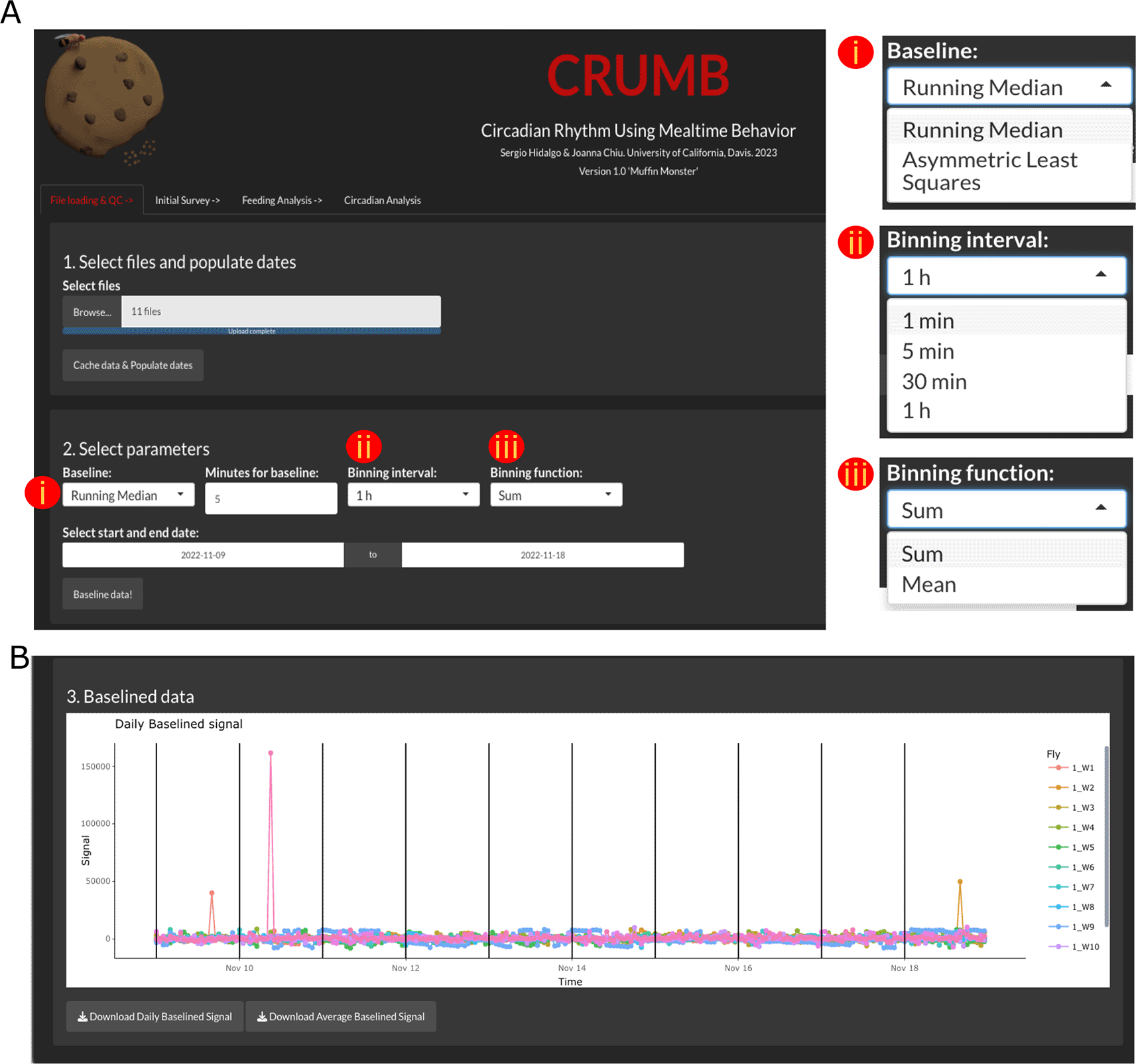 (A) Raw data files and dates of the experiment are loaded in step 1. In step 2, the user can select parameters to baseline the raw data by choosing (i) a baseline function and time duration window for the Running Median option. Additional parameters including (ii) a binning interval and (iii) a binning function can be indicated for visualization purposes. (B) Baselined data are visualized using ‘plotly’ interactive graphs, allowing individual inspection of data. Data can be downloaded as CSV files.