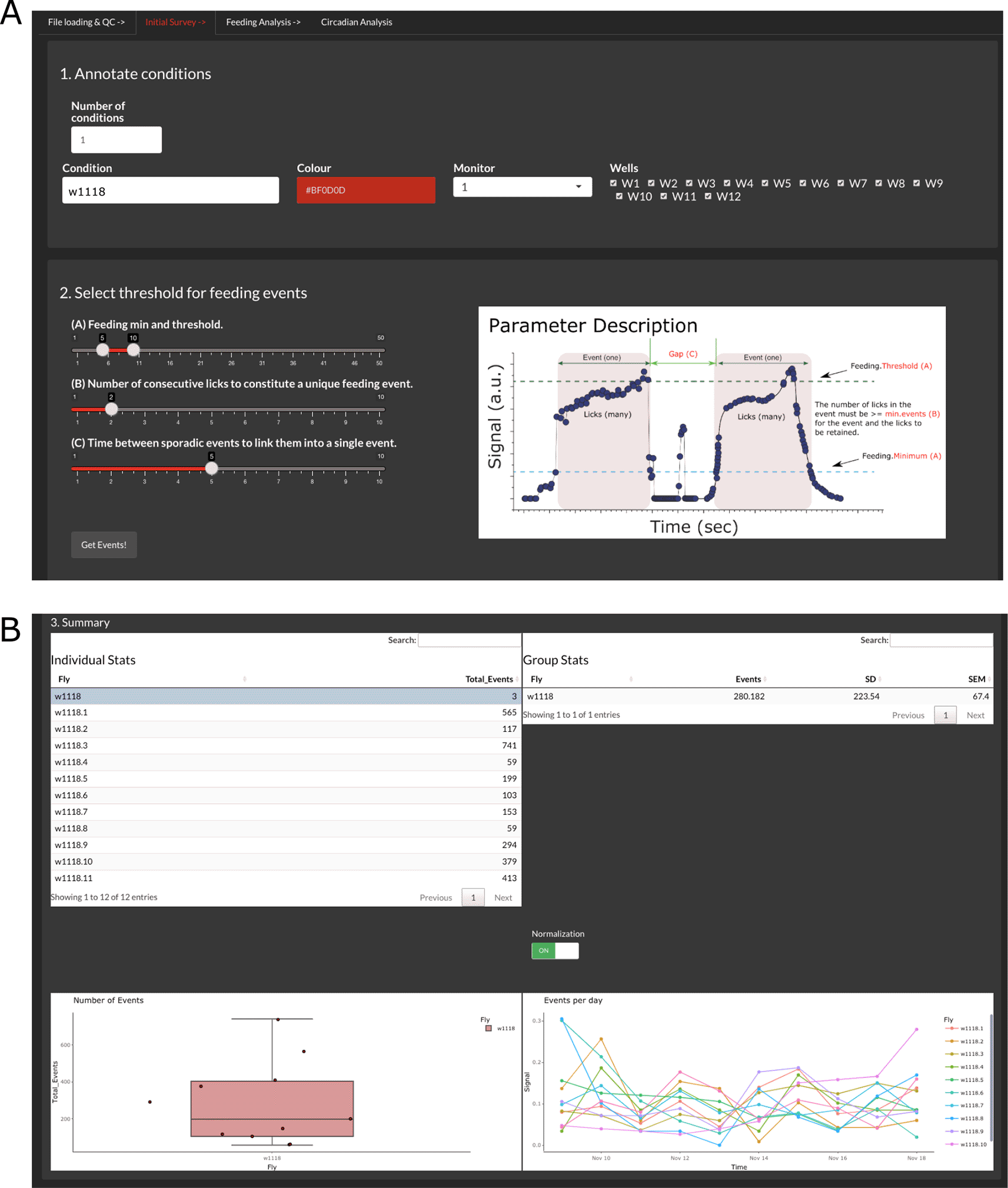 (A) In step 1, users can define conditions per monitor and/or wells. Step 2 allows the selection of the parameters required to calculate feeding events based on the baseline data. The ‘Parameter Description’ image (modified from FLIC code master) provides definitions for these factors. (B) After the calculation, the summary section displays the processed data as individual events per fly/well (top left), average events per group (top right and bottom left), and the number of events across days for each fly (bottom right). The feeding activity of each well can be scaled to the highest value of that well throughout the duration of the experiment by using the normalization switch. This selection is inheritable, meaning that the rest of the analysis will be conducted with the normalized data. Additionally, users can select outliers from the ‘Individual Stats’ table to exclude them from the rest of the analysis.