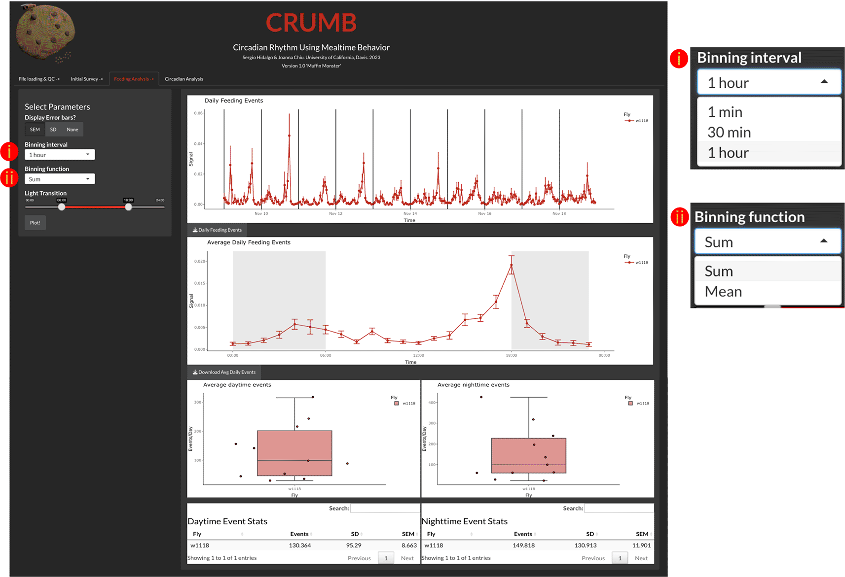 Users can access and visualize the feeding events across the duration of the experiment (top graph) with the time resolution defined by (i) a binning interval and (ii) a binning function. The daily feeding events are averaged and displayed as an activity profile graph (middle graph) with gray backgrounds indicating when the lights are off. The duration of day and night can be selected under ‘Light Transition’ from the left panel where the region between the two sliders is when the light is on (red line). This selection also serves to calculate the daytime feeding events (bottom left graph and table) and nighttime feeding events (bottom right graph and table) per well. Error bars for the top two graphs can be defined by the user as Standard Error of the Mean (SEM), Standard Deviation (SD), or can be omitted if desired, by selecting ‘None’. Additionally, data are available as CSV files for download using the download buttons below each graph.