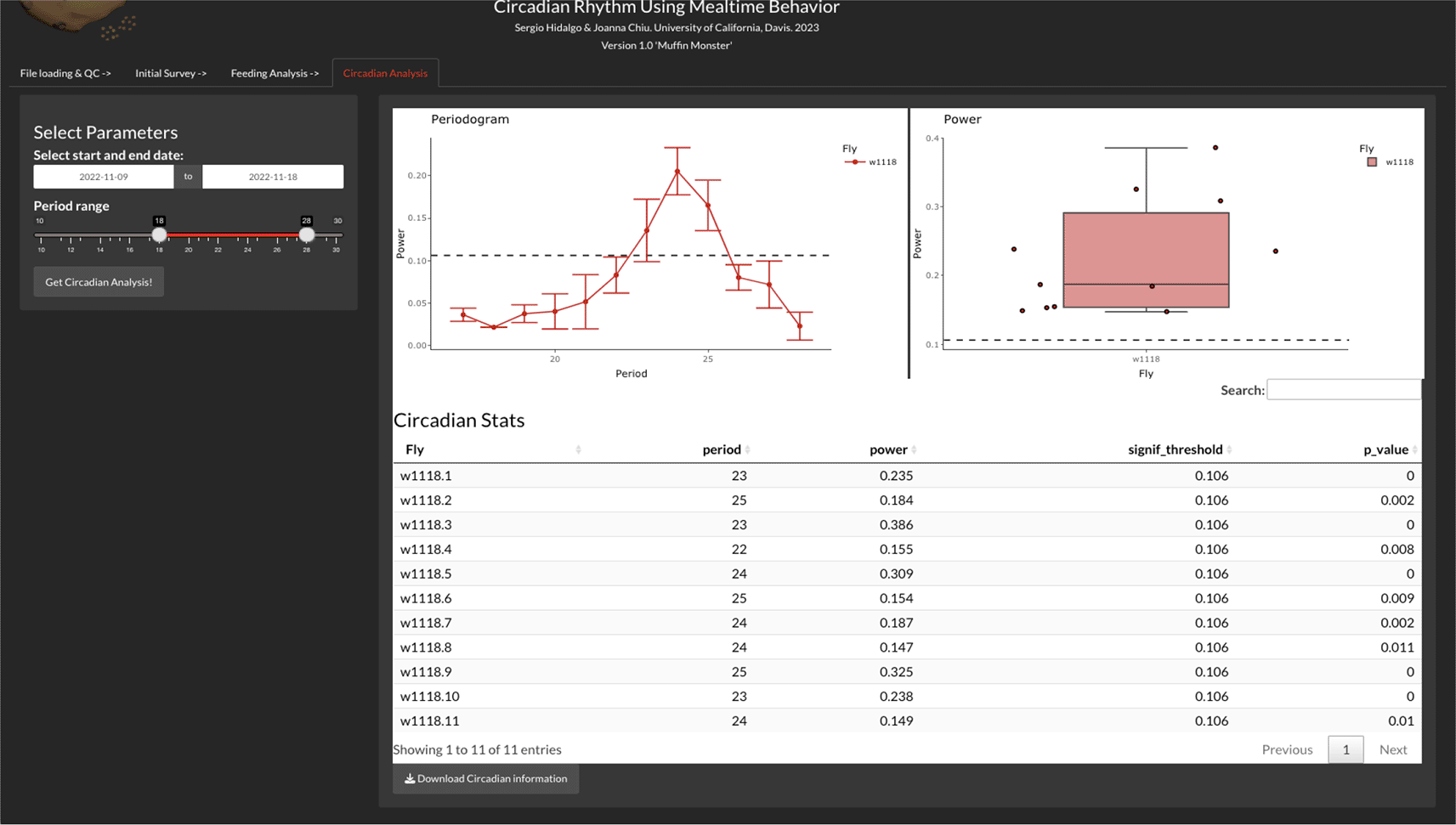The output of this analysis is a periodogram graph, showing the period over the power from the autocorrelation function and a boxplot of the highest power for each condition. Finally, a table (exportable as CSV) is obtained with the period, the highest power for each fly, and the p-value for that period estimation. The significant threshold (signif_threshold) is also shown in the table and is displayed as dotted lines in the periodogram and the power graphs (Figure 4).