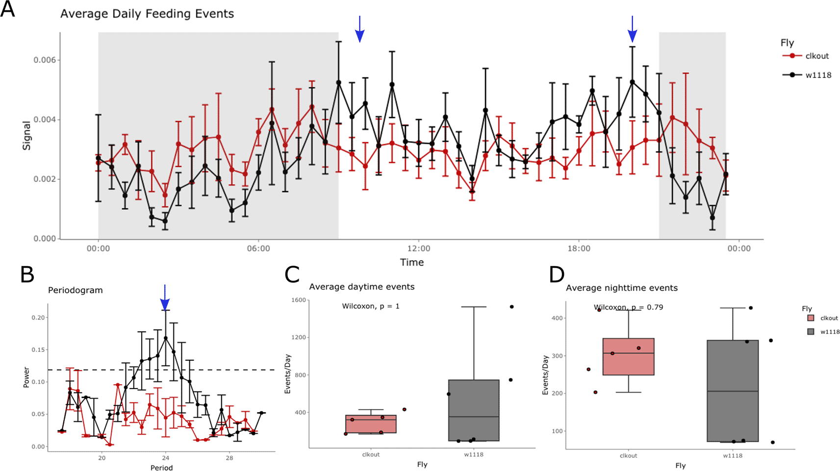 (A) Feeding activity was recorded for 2 days under 12:12 light-dark cycles followed by 4 days in constant darkness (DD) for a circadian mutant (clkout, red) and control flies (w1118, black). Average activity across days for control flies shows increased feeding activity anticipating lights on (09:00, blue arrow) and lights off (21:00, blue arrow), which is absent in mutant flies. (B) Control flies show a 24 h period of feeding activity as seen in the periodogram (black lines, blue arrow), a feature that is not observed for the mutant flies (red line). The dotted line represents the threshold for significance in the autocorrelation analysis. Analysis of average daytime (C) and nighttime (D) feeding events shows no difference between mutant (red) and control (black) flies. Error bars in A and B are displayed as SEM.