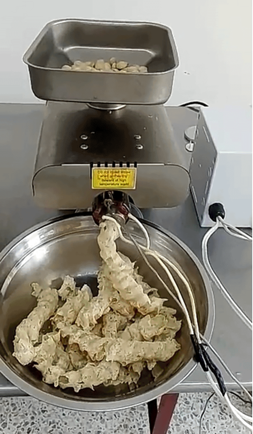 The defatted sacha inchi (SIF-DM) flour was obtained as follows: the sacha inchi kernel was placed in the hopper of the automatic tactile oil extraction press (CGLDENWALL, store model K28, Shanghai China), as shown in Figure 1, a temperature of 124 °C was used. The press used the screw, which pushed the material into the main pressing cylinder, the pitch of the screw and the depth of the spiral were reduced, decreasing the volume available in the chamber, and the material being subjected to high pressure accompanied by friction against the closed bottom wall of the cylinder produced the extraction of the oil. The oil then flows through the existing orifices in the cylinder. The remaining material exits through the pressing system and the cake outlet nozzle.
