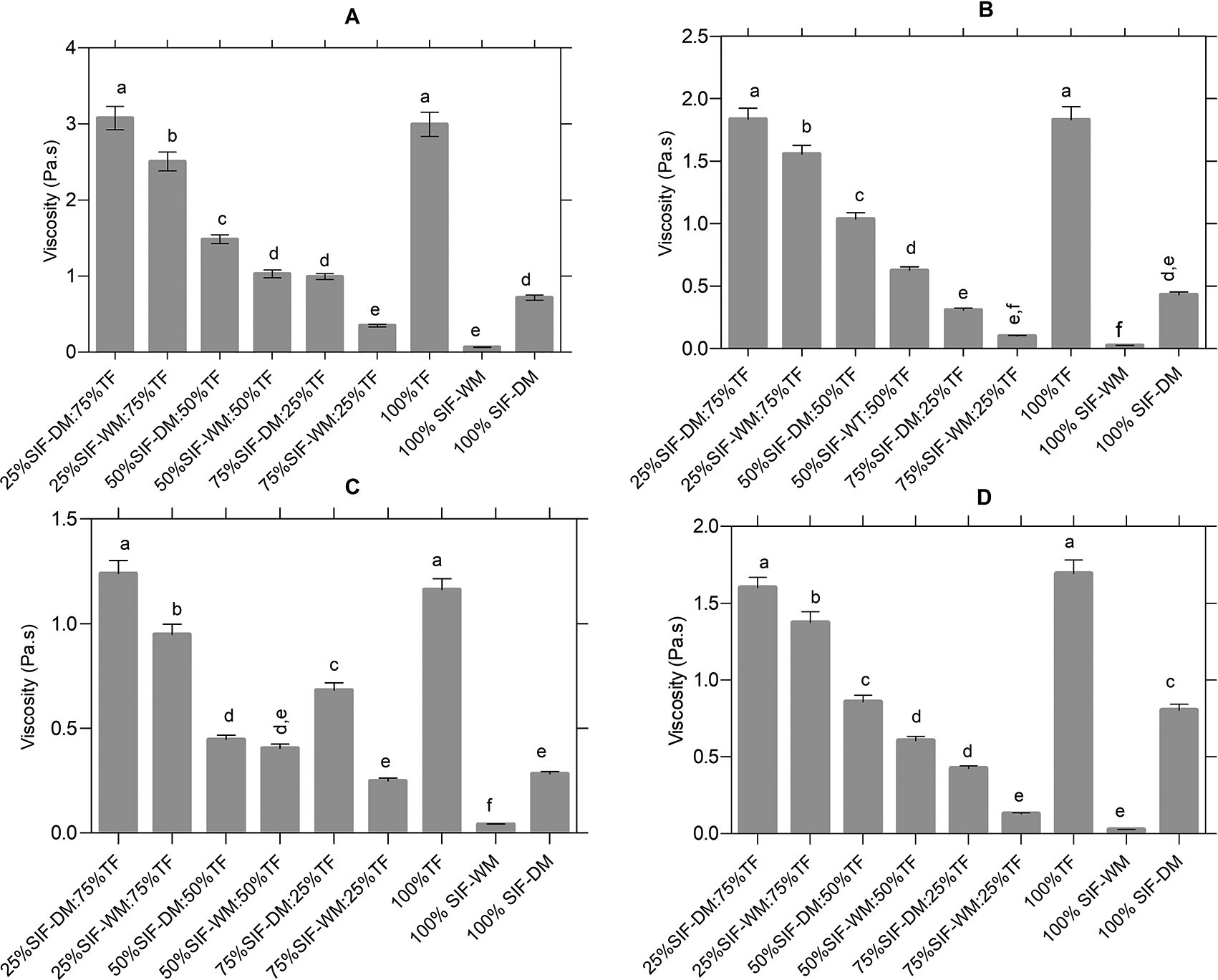 The viscosity profile was carried out to know the evolution of viscosity during the heating and cooling phase in the raw materials and in each of the blends. According to the statistical analysis, the different flour blends significantly affect viscosity p < 0.05. Figure 2A shows the significant differences between the blends in the viscosity peak, according to the post hoc Tukey analysis five different groups identified with letters from “a” to “e” are classified. In group “a”, the samples with the highest viscosity (25%SIF-DM:75%TF and 100%TF) with values of 3.08 Pa.s and 2.99 Pa.s respectively, and in group “e”, the samples with the lowest viscosity value (75%SIF-WM:25%TF and 100%SIF-WM) with values of 0.35 Pa.s and 0.64 Pa.s respectively.