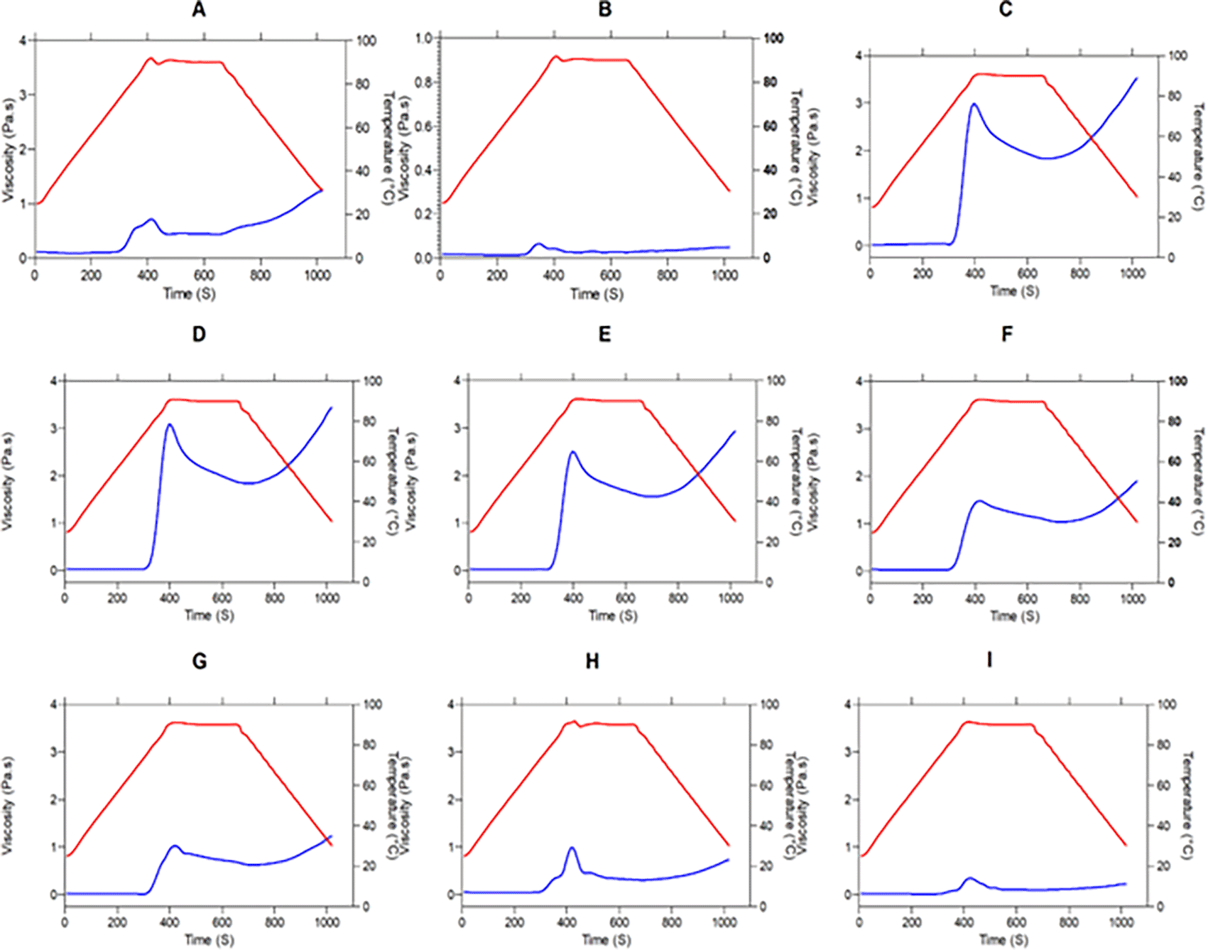 Figure 5 presents the moduli G′ (red color) and G″ (blue color) as a temperature function (°C). We observe the behavior of the elastic and viscous moduli for each mixture, evidencing an increase in the moduli as the temperature sweeps are performed. Except for graphs “A” and “H”, the mixtures behavior during heating is similar, since the two moduli increase their value, decreasing the difference between them and achieving a crosslinking, where the material ceases to have a viscous character, i.e., it stops being liquid and becomes elastic properties characteristic of a solid. This behavior is characteristic of materials undergoing liquid-solid phase transformations. When the molecules gain weight, in this case, when the starch granules interlock, the loss modulus G" decreases and the storage modulus G′ increases, reaching a point of equilibrium that is its material change of nature, its solidification.