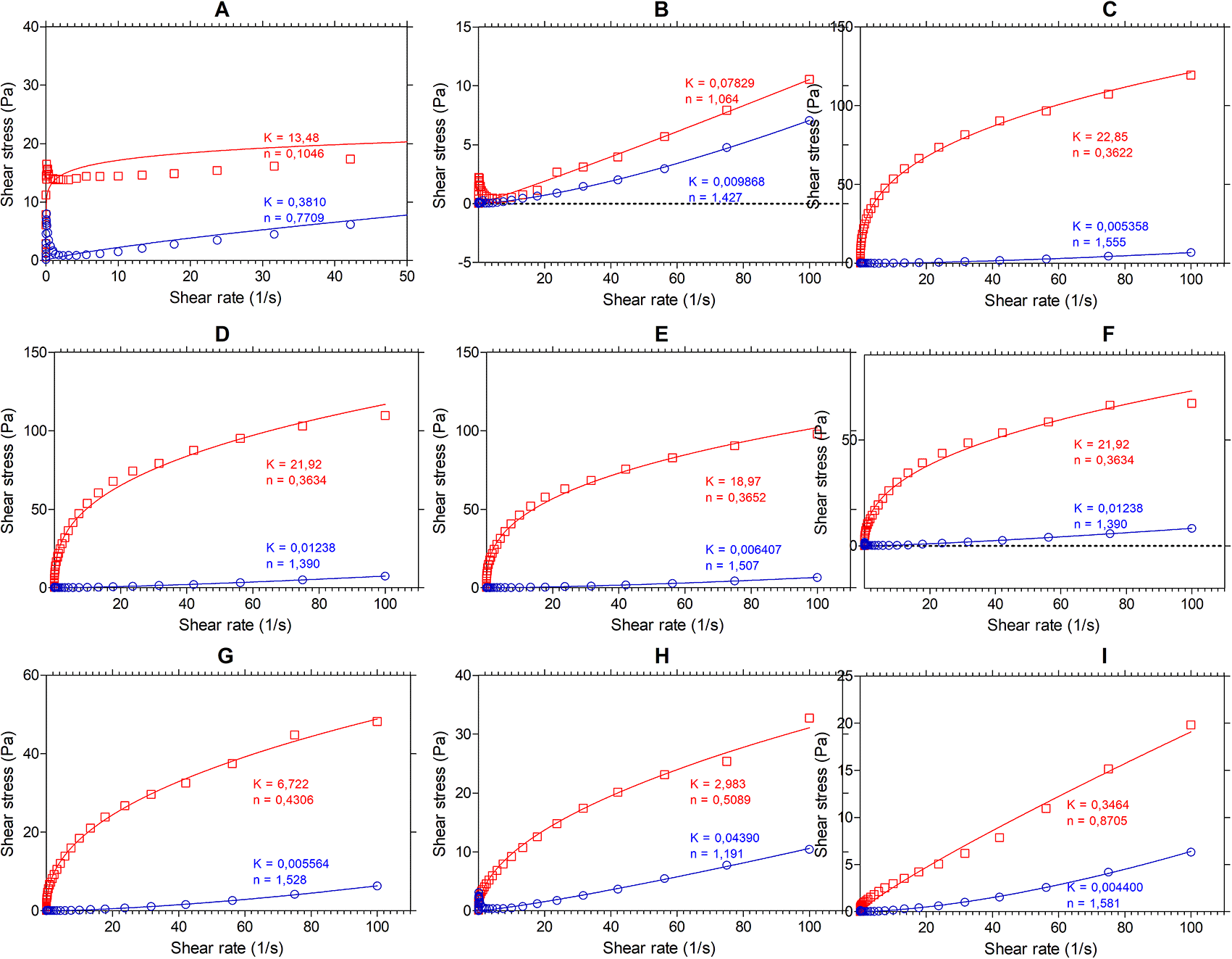 Flow curves (shear stress versus shear rate) were obtained and fitted to the power law model shown in Equation 1.