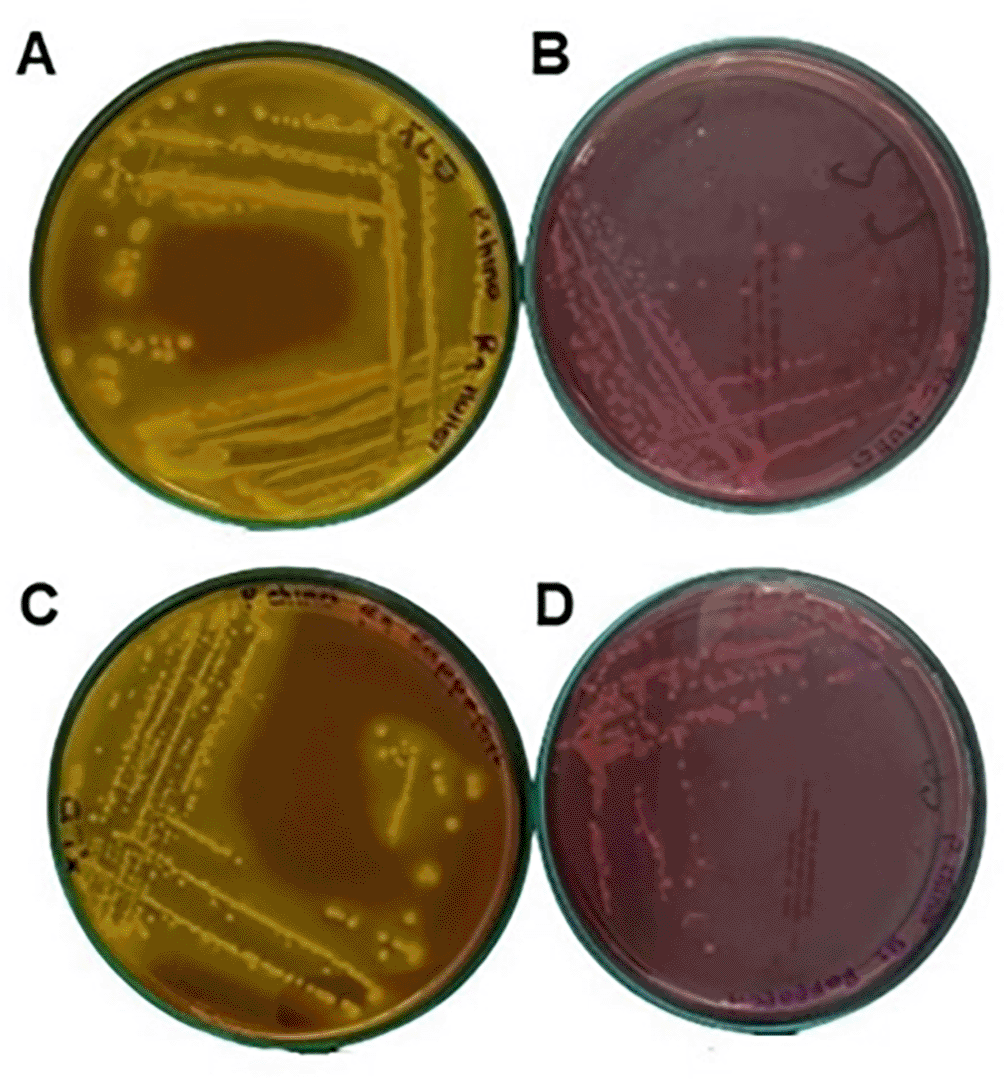 A: MKTTn broth, C: RVA broth, seeding of taro flour sample on Salmonella-Shigella agar B: MKTTn broth, D: RVA broth.
