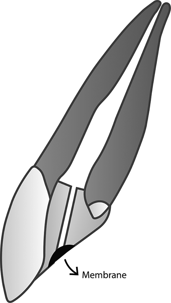 The novel membranous restoration system described below (please see Figures 1 – 4) is expected to decrease the working time in endodontic treatment, as it can replace the time-consuming conventional obturation techniques. Any conventional sealer for obturation, including those that use nanoparticles, and any established technique, cannot give a perfect seal in the root canal system. Naturally, oxygen can flow automatically and fill any space it can infiltrate. Using oxygen as obturation biomaterials will hopefully be easier and more time-saving than all current obturation techniques that use solid substances. Before applying this restoration design, proper root canal preparation, including debridement and disinfection, should be done first.