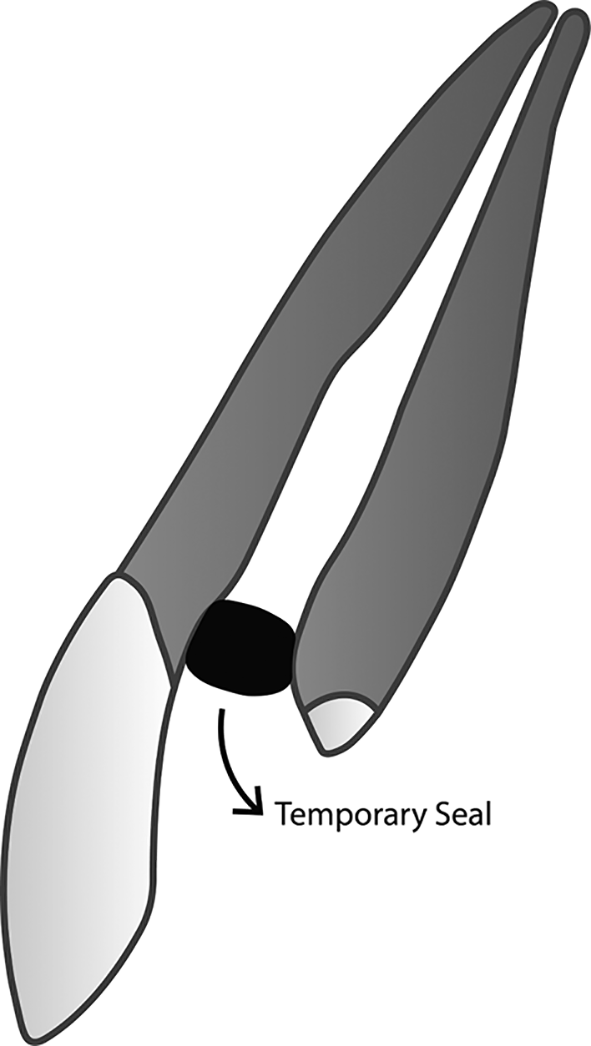 Access to the root canal should be covered tightly to prevent debris and fluid from entering the clean and dry root canal. A small piece of rubber, taken from a rubber dam sheet, for example, can be used to seal the access to the root canal. Once the access is closed, tooth preparation can be performed.