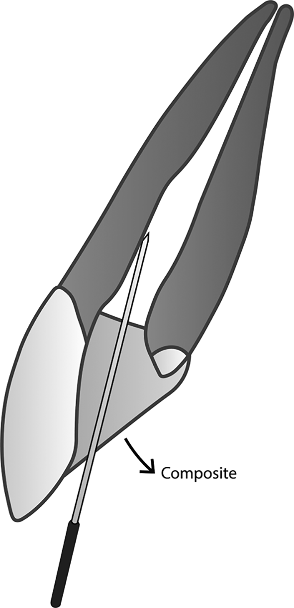 A smooth broach can be bent to make it possible to adjust the direction of the duct in accordance with what we have designed. The orifice of the duct can be placed on the surface where fluid and debris will be difficult to accumulate and is easy to clean when brushing teeth. Any other bendable needle, such as a finger spreader, can also be used as long as the size is suitable, can be pulled out from the restoration, and can be sterilized before inserting it to the root canal.