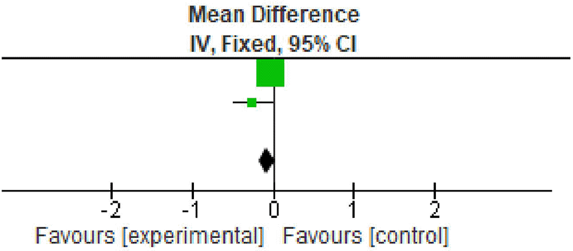All the included studies reported PI at baseline and after nine months.20,22,25 However, two studies reported data in the form of mean±standard deviation. All the studies showed statistically significant reduction in plaque index at nine months follow up period. The overall meta-analysis showed marginally significant reduction in plaque scores after nine months. (Mean Difference -0.52; 95% CI -1.30 to 0.27; p=0.03; I2 78%; two studies; 33 participants). However, in view of significant heterogeneity (I2=78%), the results need to be interpreted with caution because of increased heterogeneity as shown in Table 3 and Figure 2.