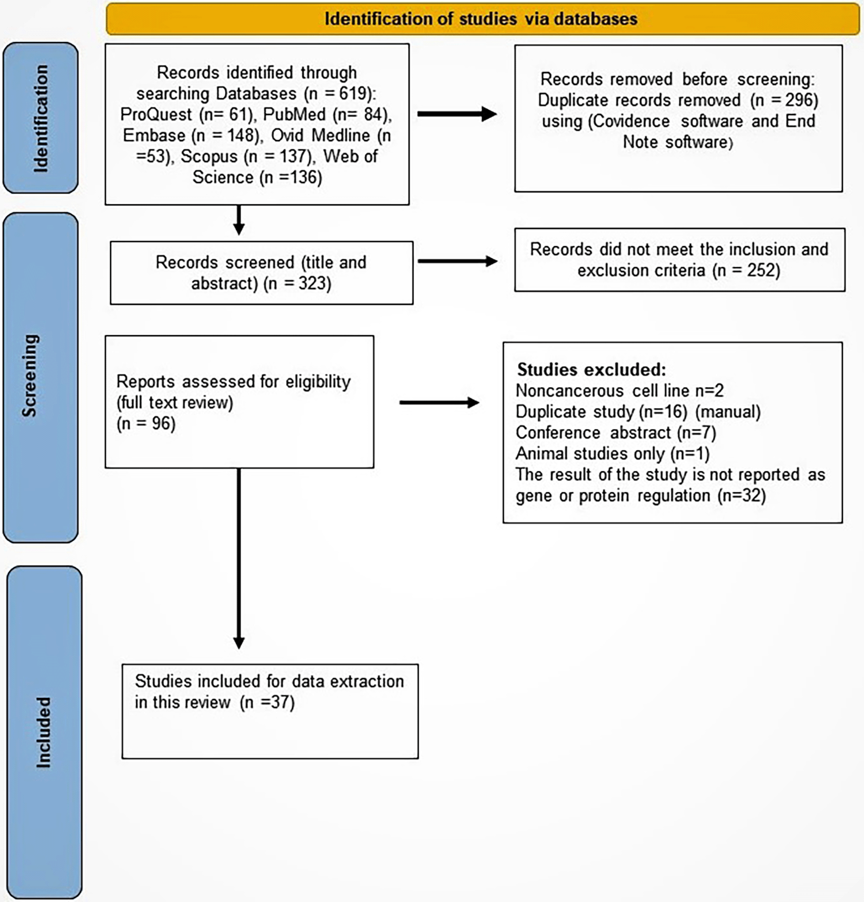 This review was carried out according to the guidelines of the Preferred Reporting Items For Systematic Review And Meta-Analysis (PRISMA).30 Six databases (PubMed, Pro-Quest, Web of Science, Scopus, Ovid Medline and Embase) were searched using Medical Subject Heading (MeSh) and keywords “tumor*”, “gene*”, “protein*”, “tocotrienol*”, “neoplasm”, “cancer,” and “cell line”. Papers reporting on the effects of T3 on various types of human cancer cell lines, with the primary outcome being gene modulation, regulation or amplification and protein dysregulation, were selected for analysis. In addition, the search was restricted to papers published in English in the last five years (January 2015 to September 2021) to use the latest evidence for this study.