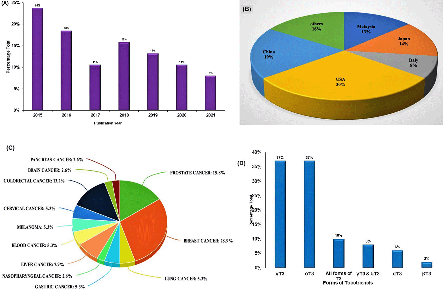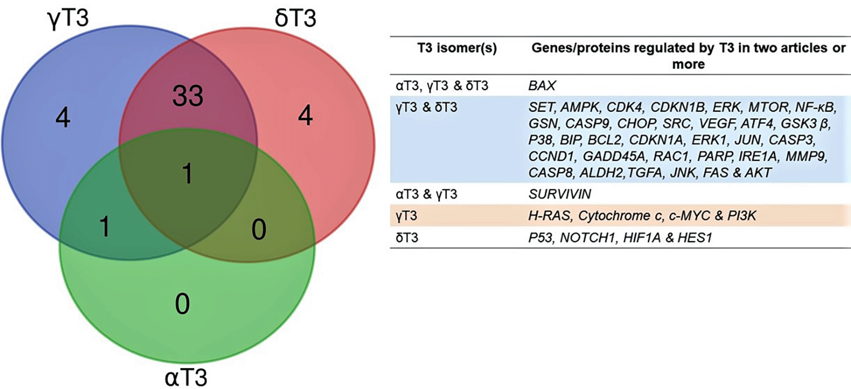 The different isoforms of T3 used in these studies showed prominent anticancer activities (Figure 2D). While most studies used gamma-T3 (γT3) and/or delta-T3 (δT3) from different sources, only one study investigated the effect of beta-T3 (βT3) (Figure 2D). That could be due to the relatively stronger anticancer potential of γT3 and δT3 and/or because of the very low concentration of βT3 in nature.