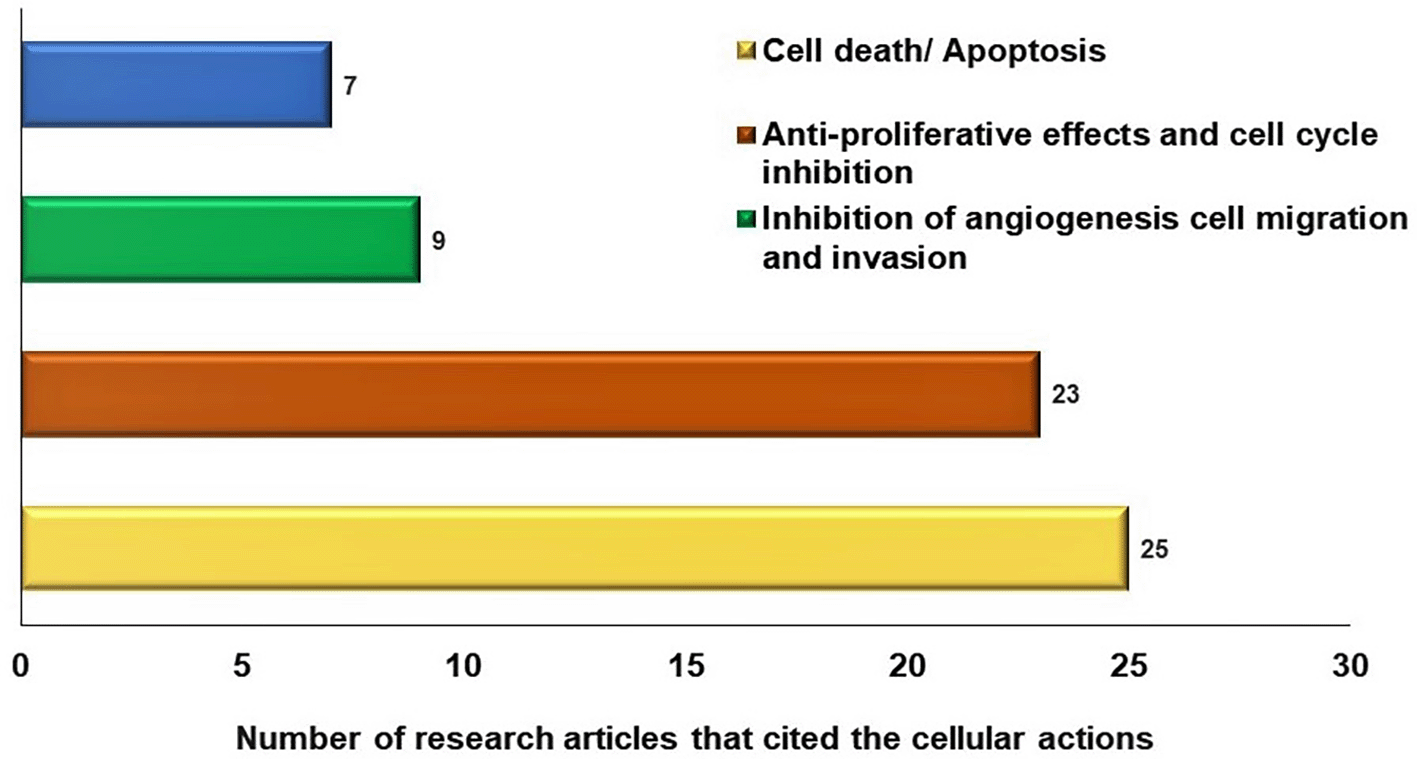Twelve types of human cancer cell lines were used in the 37 short-listed studies and these include breast cancer,14,26,33–40 prostate cancer,9,11,41–44 lung cancer,10,45 nasopharyngeal cancer,46 hepatocellular carcinoma (liver cancer),47–49 blood cancer,50,51 melanoma], cervical cancer,33,40,54 colorectal cancer,55–60 gastric cancer,61,62 brain cancer57 and pancreatic cancer63 (Figure 2C). The top three human cancer cell lines studied appear to be breast, pancreatic cancer, and colorectal cancers (Figure 2C), while nasopharyngeal and brain cancers were the least studied cancer.